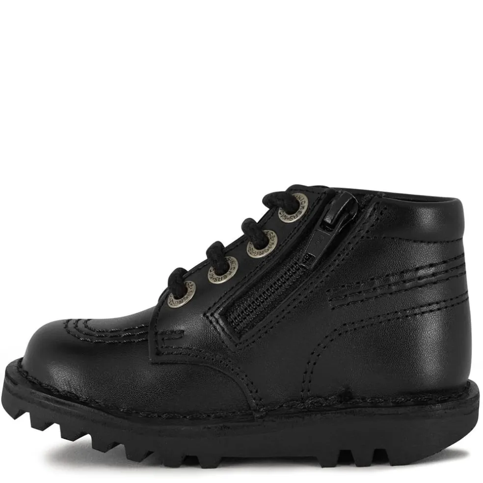 The Kickers Infants Hi Boots are crafted with a traditional leather upper with a hi cut ankle collar and a classic Kickers rugged sole.