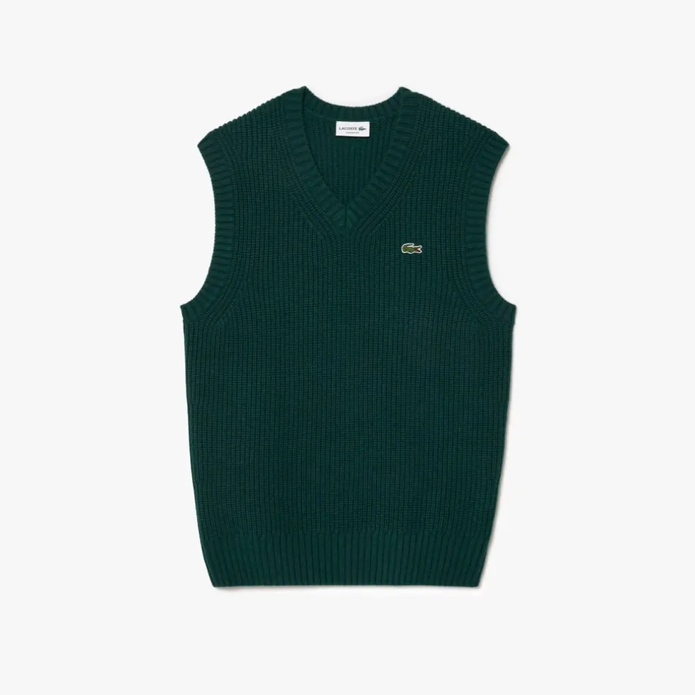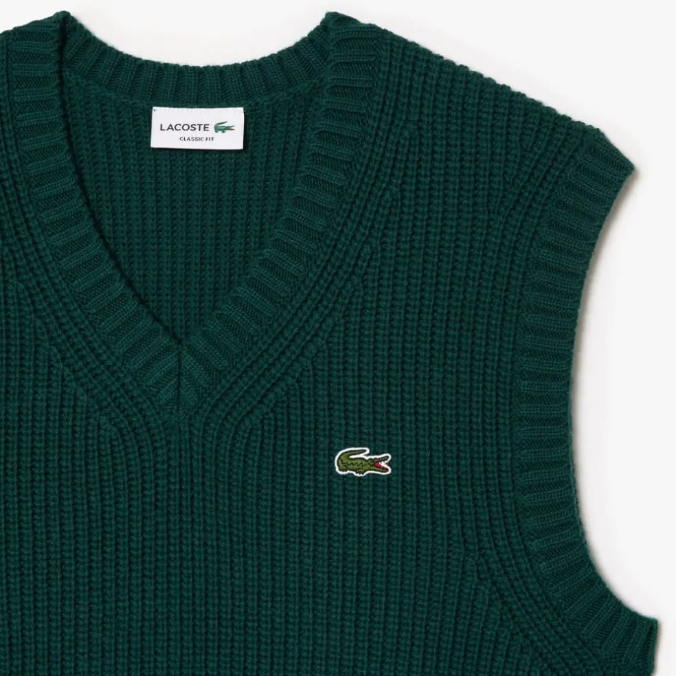 This Lacoste V-neck sweater vest is the fruit of 90 years of knitwear expertise. Made from thick carded wool, with a relaxed cut and sophisticated ribbed finish details. A modern take on a timeless style.