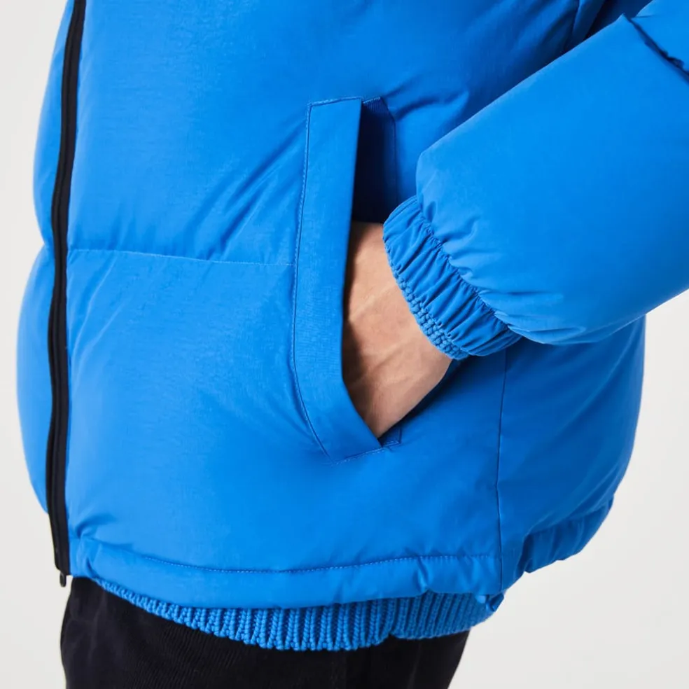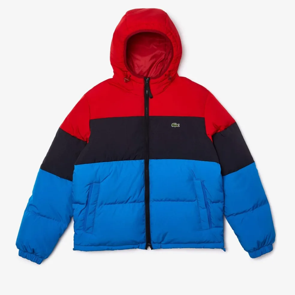 The essential outerwear pieces of Lacoste wardrobe. This very puffed jacket will offer you an extreme comfort thanks to its light weight. Protection from the cold is the key benefits of this jacket thanks to its its filling in a mix of 80% duck down and 20% duck feather (Our down respects the animal welfare) and its adjustable hood and bottom to stop the cold from going in. This parka will also keep you dry under light rain with its adjustable hood and its fabric finishing. This parka has also been designed to be very functional with lots of storage pockets and to be eye catching with its bold color block combo. Essential Short length developed to be worn above hips level In a water repellent taffetas fabric Inside lining is in a taffetas fabric Filling is in down with a down quality: 80/20 With attached hood with tightening system at collar Jacket fasten with zip system and snaps Details of herringbone tape around chest pocket 2 hip pockets with flap closed with snaps Adjustable bottoms with drawstring system Rib at bottom sleeve to keep you warm 1 inside chest pocket made with iconic green pocket bag and closed with zip 1 inside pocket in mesh closed with a snap at left bottom when worn 3 cm tone on tone crocodile at chest and iconic green 132 recycled branded hanger loop