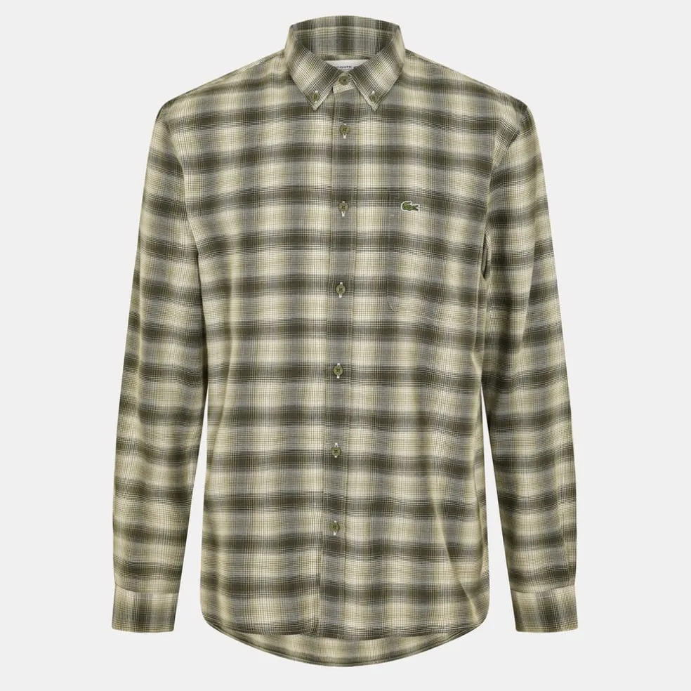 This Lacoste top features a classic plaid pattern and a button-down closure. Designed with long sleeves and a regular fit, it offers a timeless look. The iconic logo embellishment adds a touch of brand recognition.