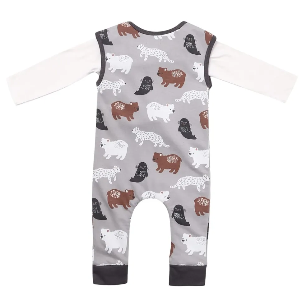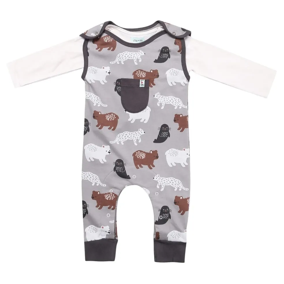 – This non-seasonal set comes with jungle animal printed dungarees and a navy stripe long-sleeve top to complete the look. Made from our super-soft 100% GOTS-certified organic cotton jersey fabrics, printed with azo-free dyestuffs these are eco-friendly, kind to your baby’s delicate skin and the environment too!
