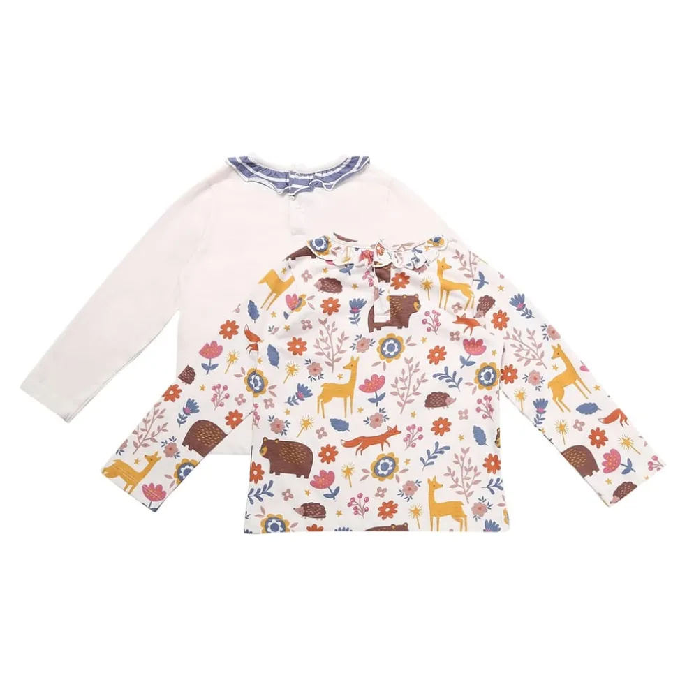 This two-piece long-sleeve top set for girls (0-8 years) features a plain ecru top with blue stripe neck frill detailing and a sweet woodland animal print top. Made from our super-soft 100% GOTS organic cotton jersey fabric and printed with azo-free dyestuffs, these are a playful contemporary wardrobe essential that’s kind to your kids delicate skins, eco-friendly & sustainable to our environment and affordable too! Find nickel-free popper fastenings for easy on-the-go dressing and gorgeous frill neck trim detailing.