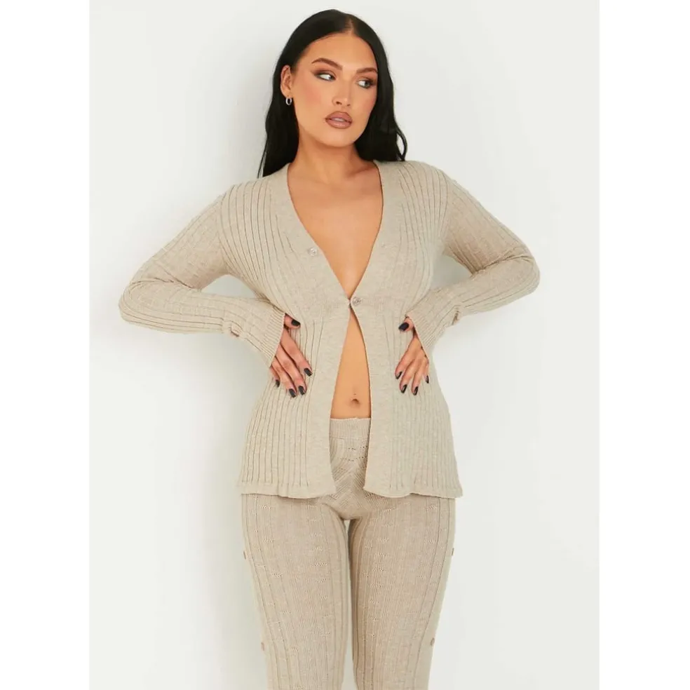 Amp up your knitwear game with our Rib Knit Button Up Cardigan, featuring a button up feature and beige ribbed material. Style with the matching bottoms for the full knitted co-ord.