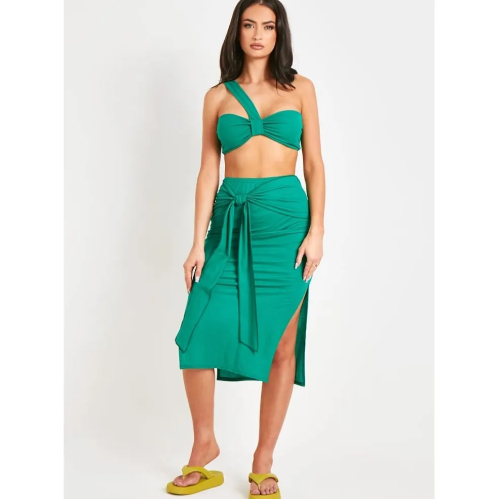 Crazy for co-ords, our Woven Linen Midaxi Slit Skirt paired with the matching bralet. Featuring a tie front with side slit in a woven material. This is perfect for them Summer days!