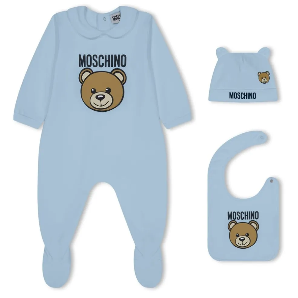 – The solid block colouring throughout, coupled with the prominent Moschino bear and lettering, exudes sophistication and exclusivity. Whether it’s an intimate family gathering or a special occasion with loved ones, this all-in-one set will ensure that the newest member of your family will be the centre of attention!