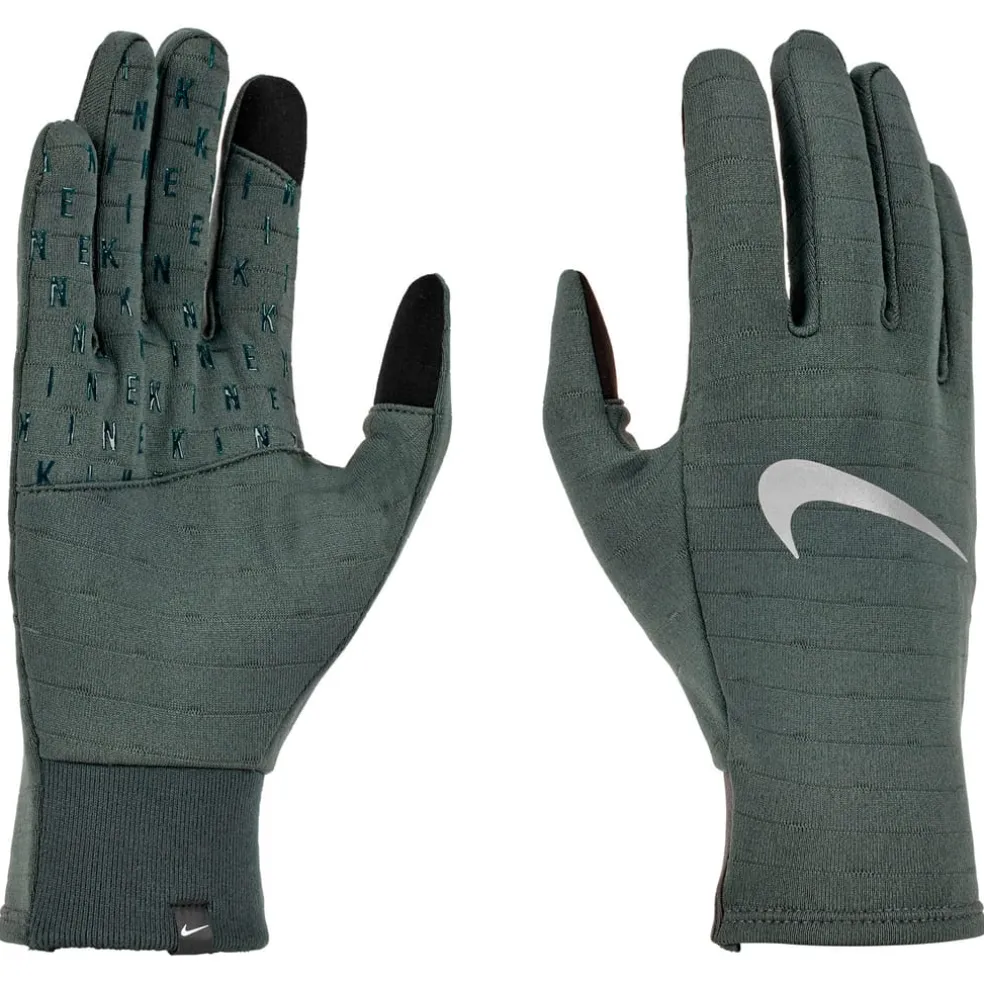 Innovative structure on the palm and fingers that follows the natural movement of the hand while running.Thumb and index finger compatible with touch screen.Brushed interior.Ribbed elastic insert.Reflective Nike logo.Nike Therma-FIT technology helps manage your body’s natural heat to help keep you warm in cold-weather conditions.Touch screen-compatible thumb and forefinger keep you connected on the go.Fitted cuff helps to keep warmth inside the glove.