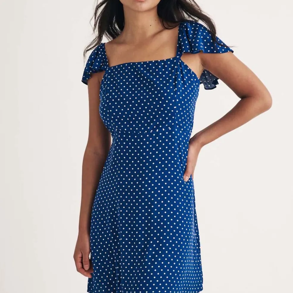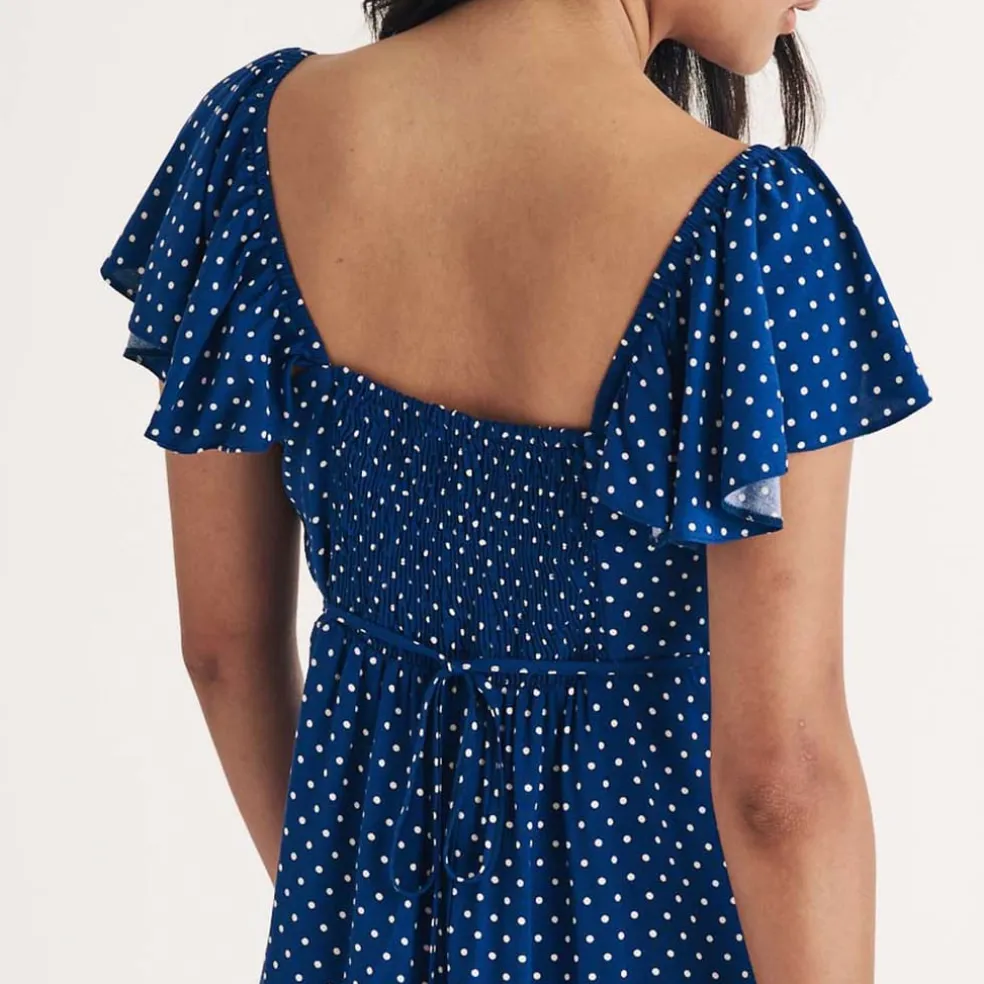 Made entirely from responsible viscose, this blue and white polka dot print is perfect for garden parties in the sunshine. Shirring at the back adds to the fit. Elevate yours with flat pumps.