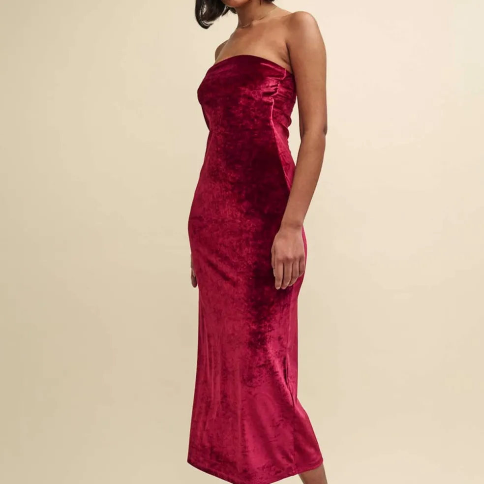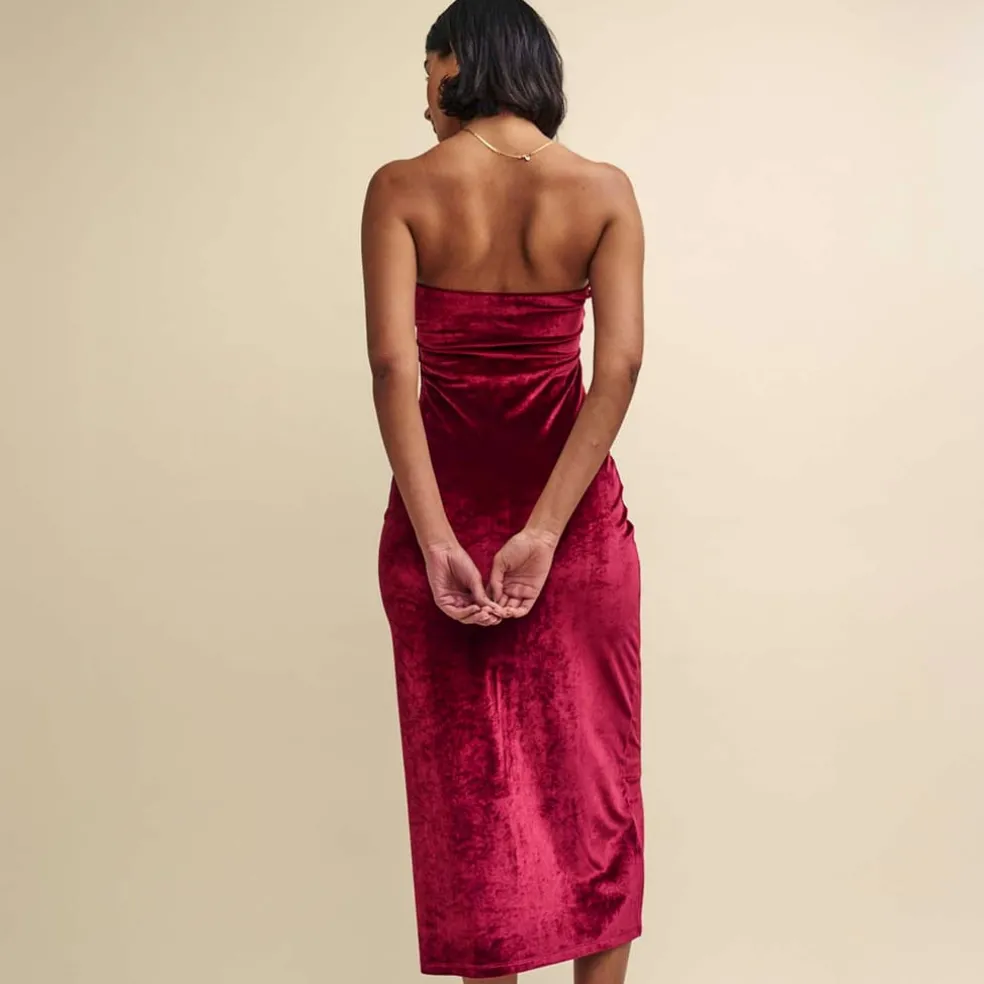 “A red bandeau dress in glamorous responsible velvet. Made from a blend of recycled materials, the plush fabric includes a touch of stretch for an always perfect fit. Style yours with jewellery and barely-there sandals. • Designed for a close cut ”
