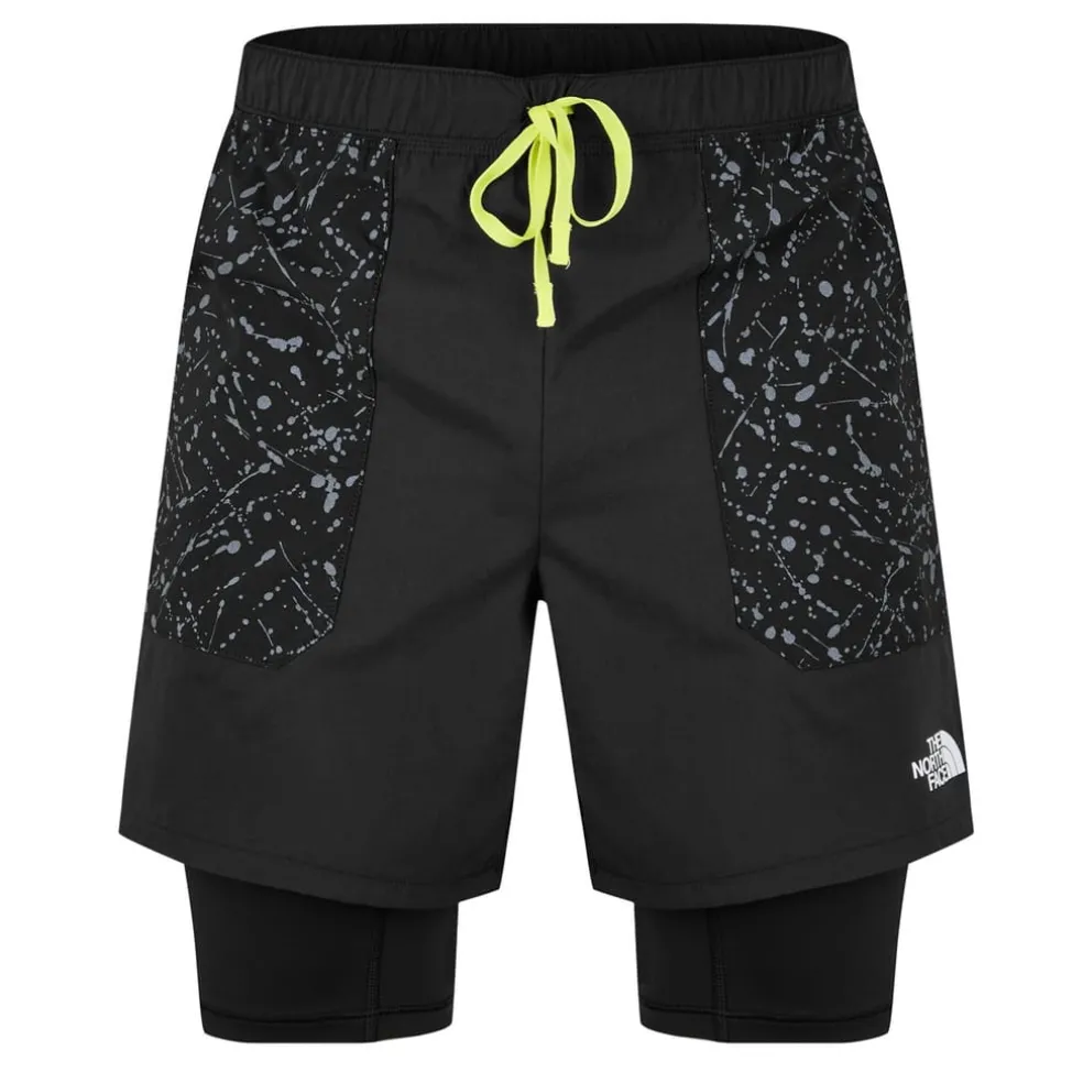 Elevate your workout with North Face running shorts, designed for performance. These two-in-one shorts feature a drawstring closure and inner shorts for added support. The graphic print adds a stylish touch, while the pocket and logo embellishments enhance functionality. Part of the activewear collection, these shorts are perfect for athletic pursuits.