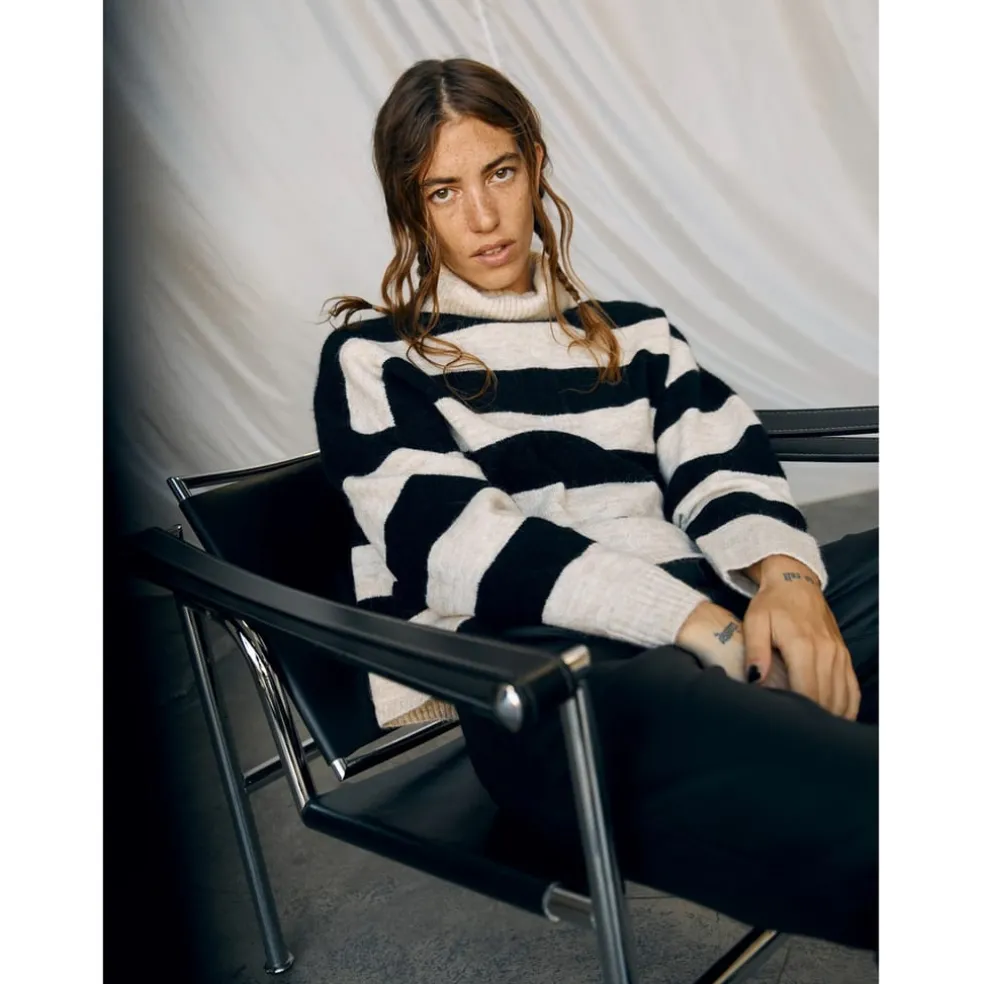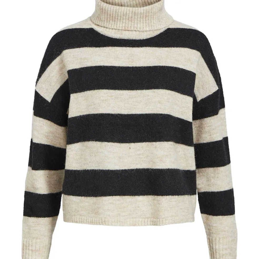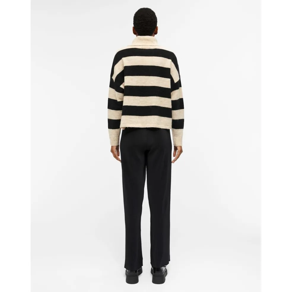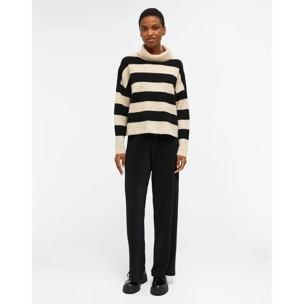 The Object Nina sweater features a turtleneck and long sleeves with drop shoulders. Designed with a relaxed fit, this top showcases a stylish horizontal stripe pattern. Ribbed cuffs add a refined touch, making it a versatile addition to your wardrobe.