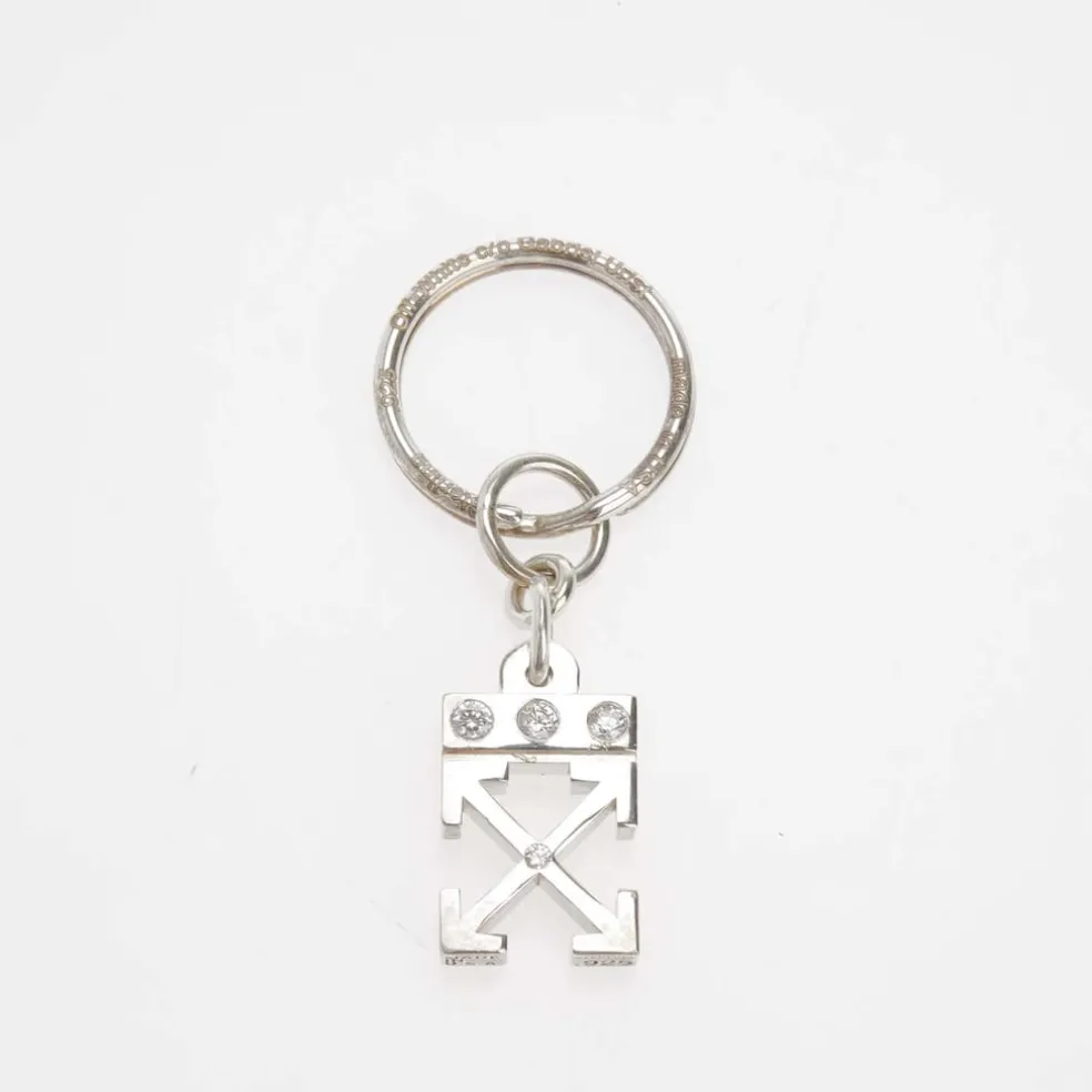 Silver crystal arrows key holder. This collection is a revival of Off-White’s iconic archive pieces, from the Jitney bag, the Cowboy boot and the arrows. The artist Gabriel Urist translated them into necklaces, pins, and keychain accessories. Each creation is defined by it’s metal-forming technique: a combination of hand-carved, machined, fabricated and computer generated parts. These mainly silver sterling pieces include small cubic zirconia and a little bit of brass