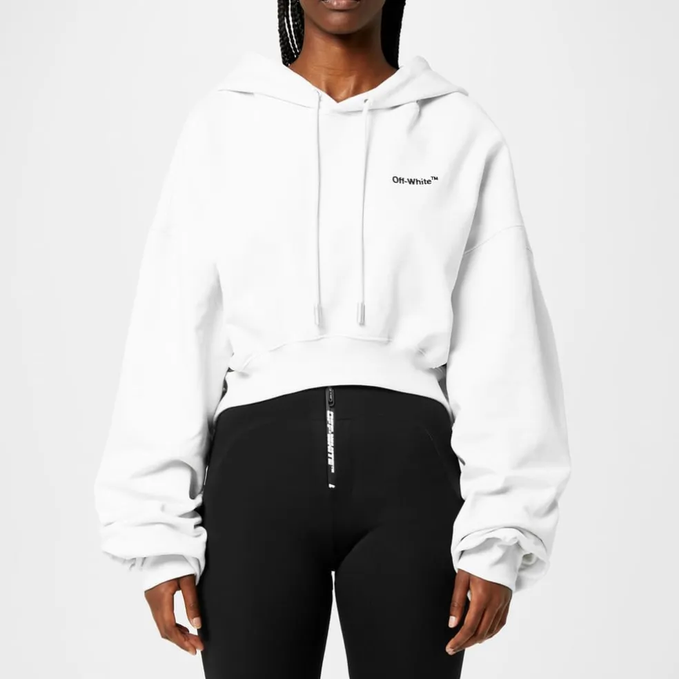 Discover the Off White cropped top, featuring a hooded design with a drawstring closure. This relaxed fit piece is crafted with a solid pattern and adorned with a logo embellishment, offering a stylish and contemporary look.