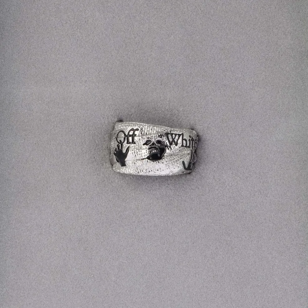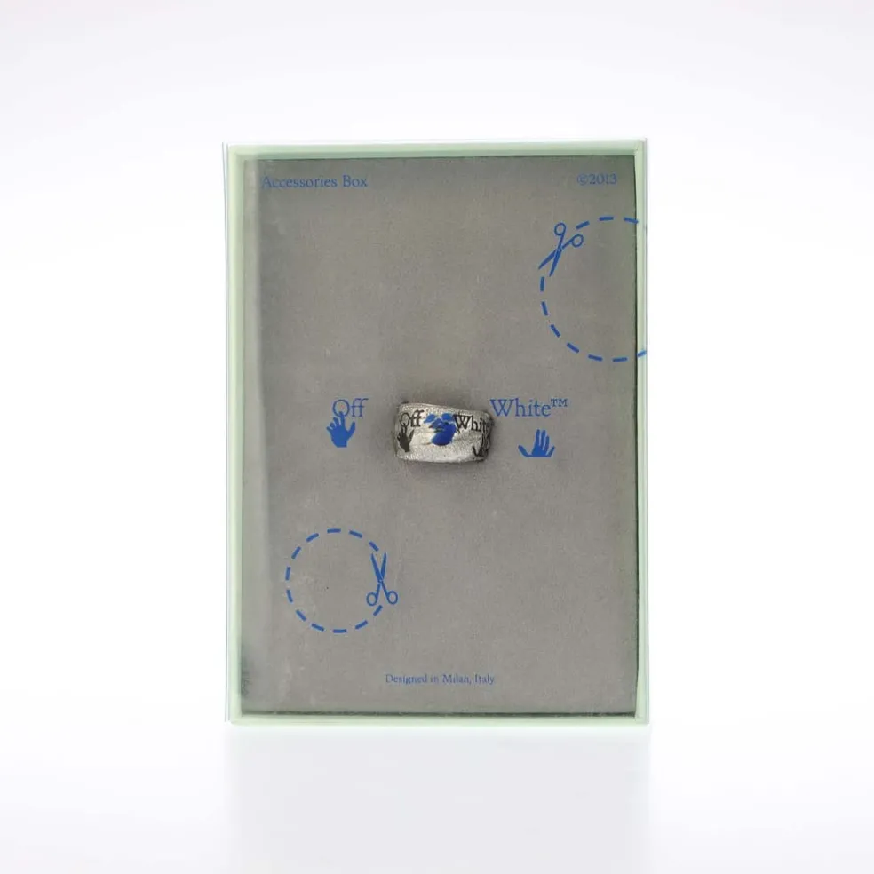 – Silver-tone ring featuring signature swimming man and Off-White branding.