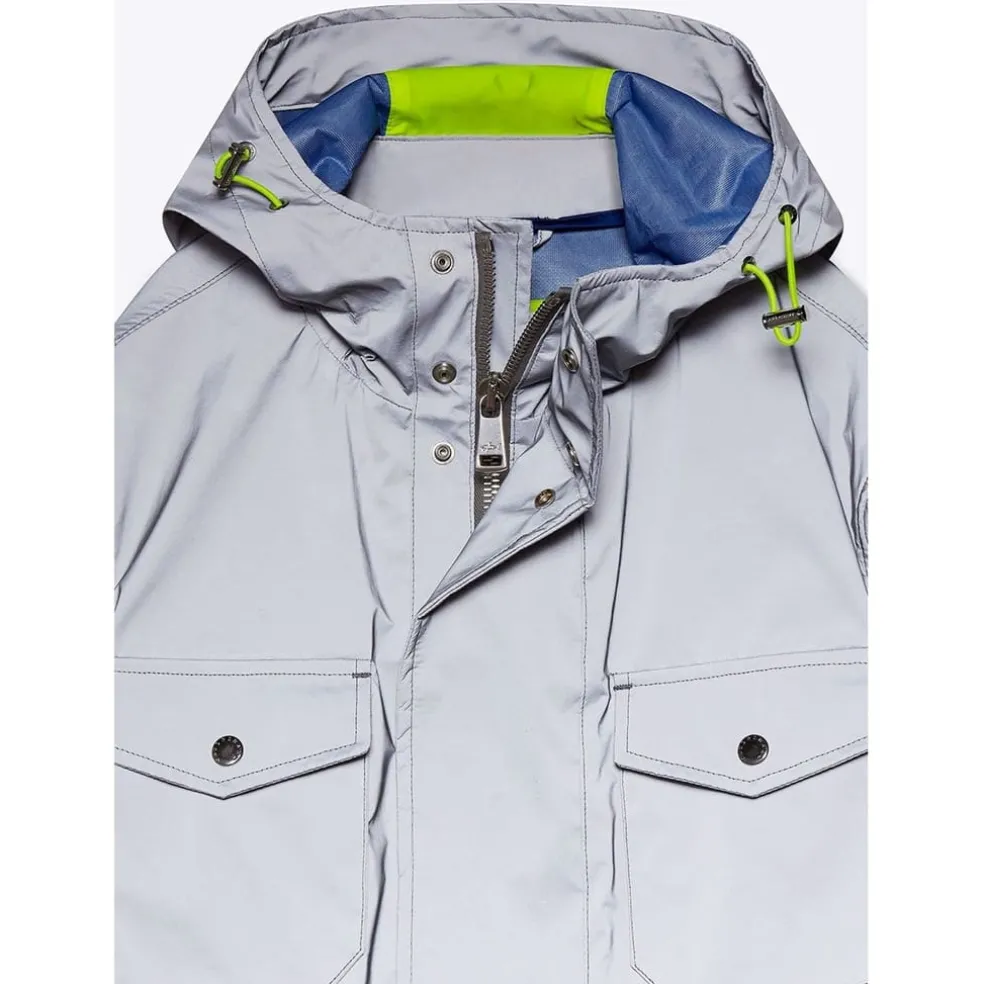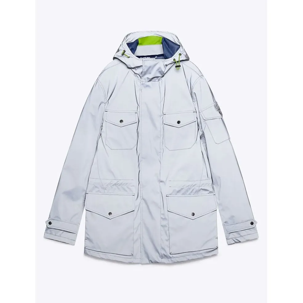 Paul & Shark Reflective Parka in Silver. Make sure you’re on your best behaviour when wearing the Paul & Shark Reflective Parka, because there’s no way you’re going incognito with this hi-shine flou fabric. Thermo-taped seams make sure the wind and rain are kept out. Toggle adjustable hood, and multi pocket front.