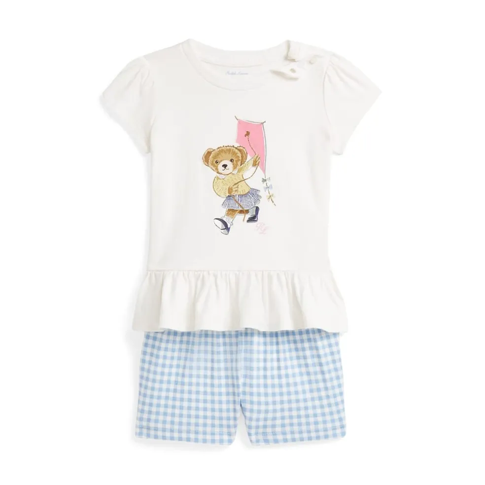 – The tee sports a delightful ruffled hemline and the new Polo Bear graphic print at the chest.