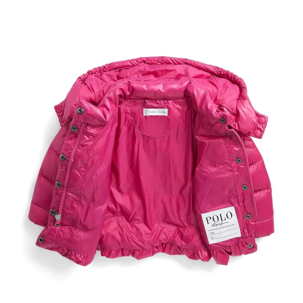 Keep your little one cosy and stylish this season with the Bomber jacket from Polo Ralph Lauren. Expertly crafted from 100% polyester for a luxurious feel that is both breathable and durable enhancing their comfort with its soft, lightweight appeal whilst elevating their outerwear ensemble with a layer of luxury. Framed with long sleeves with elasticized cuffs, and zip pockets, the jacket is both stylish and practical. Featuring a fully lined interior and 700 fill power down for an insulating feel this coat is perfect even on the chilliest of days especially as the loft provides further heat retention. Additional coverage comes with the zip-off hood,mocneck and water-repellent feature. Designed in a classic colourway in a shiny finish this coat is elevated by the iconic pony motif on the left for a distinctive finish.