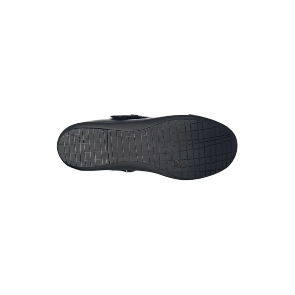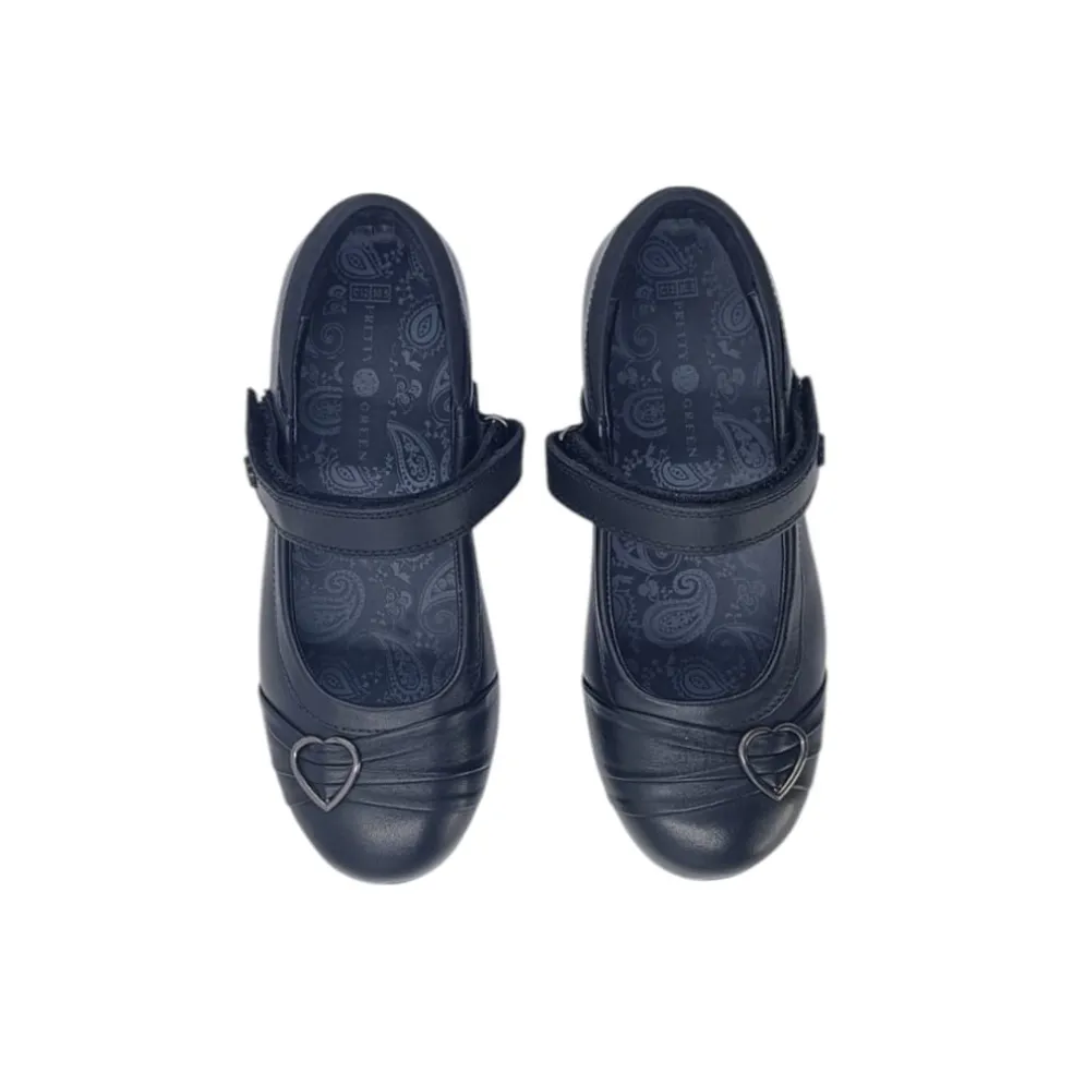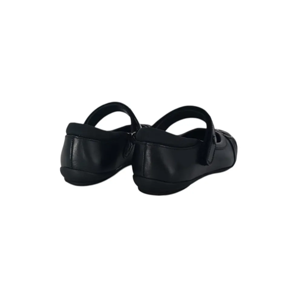 – The PG Loreto Chd is a stylish and practical choice for school and formal occasions. Made from high-quality black leather, these ballet-style shoes feature a secure Velcro strap for easy fastening and a comfortable fit. The delicate pleated design on the toe is complemented by a subtle metal embellishment, adding a touch of elegance. A cushioned insole ensures all-day comfort, while the durable rubber sole provides excellent grip for active school days.