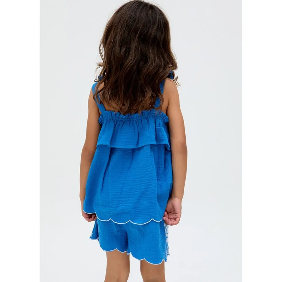 The Savvanah co-ord set features delicate all-over embroidery that adds a charming touch, while the frilled neckline adds a fun, adorable detail. The blue hue offers a cool, refreshing vibe, ideal for warm-weather days. Crafted from lightweight fabric, this short set ensures comfort for all-day wear, whether it’s for beach outings, poolside lounging, or casual adventures.