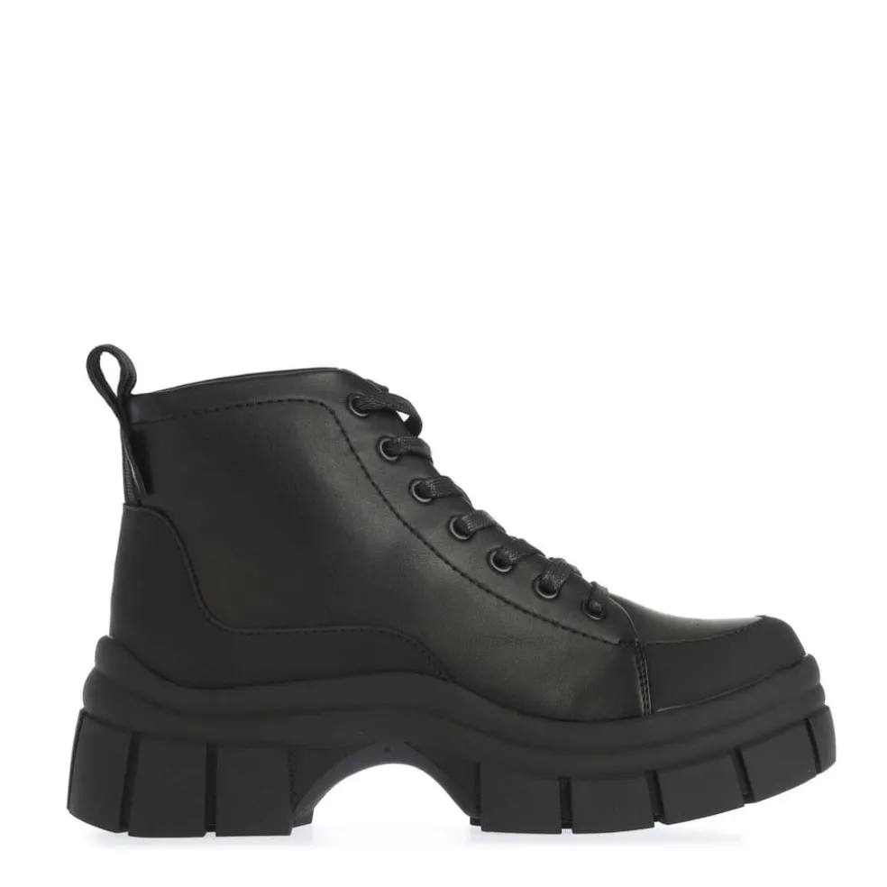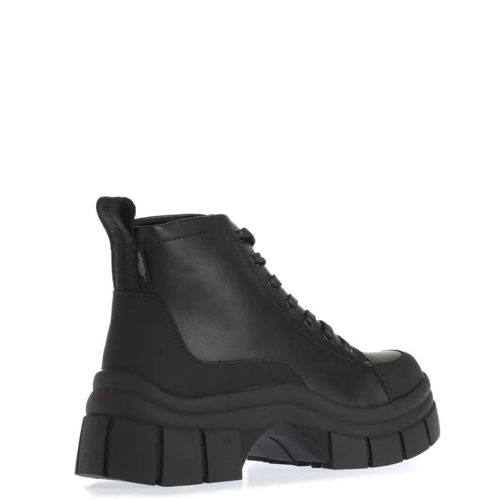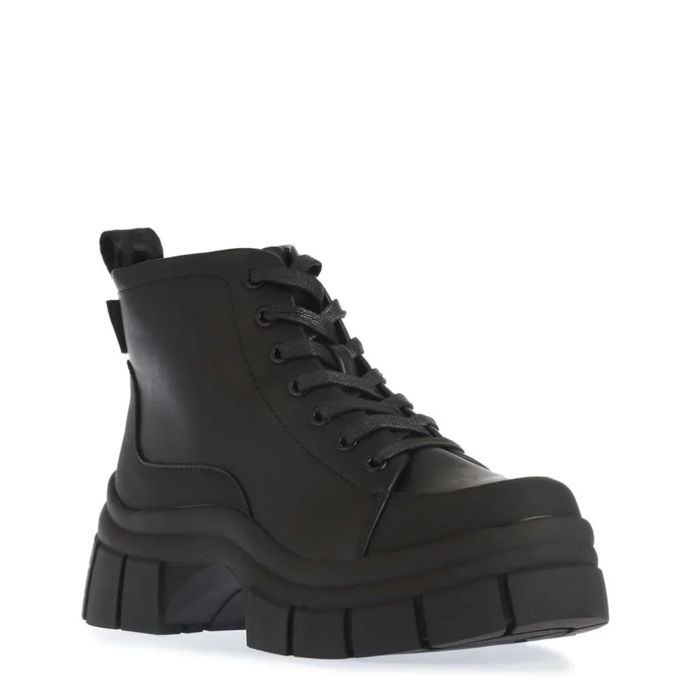 – Black faux leather and webbing upper.