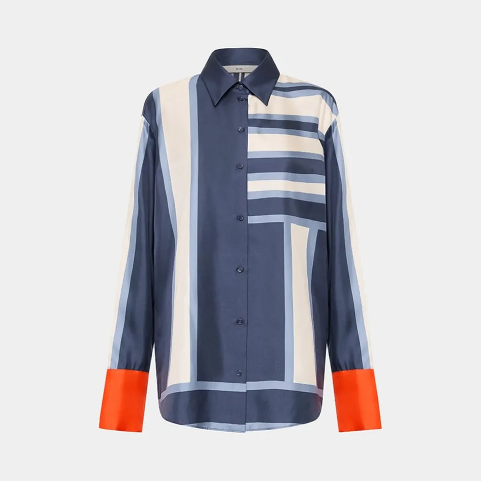 A repeat silhouette cut in our exclusive SIR. Studio print. Constructed in a lightweight silk twill. Designed with an asymmetric button feature. This long sleeve shirt is perfect to pair back with the matching pant for a complete look.