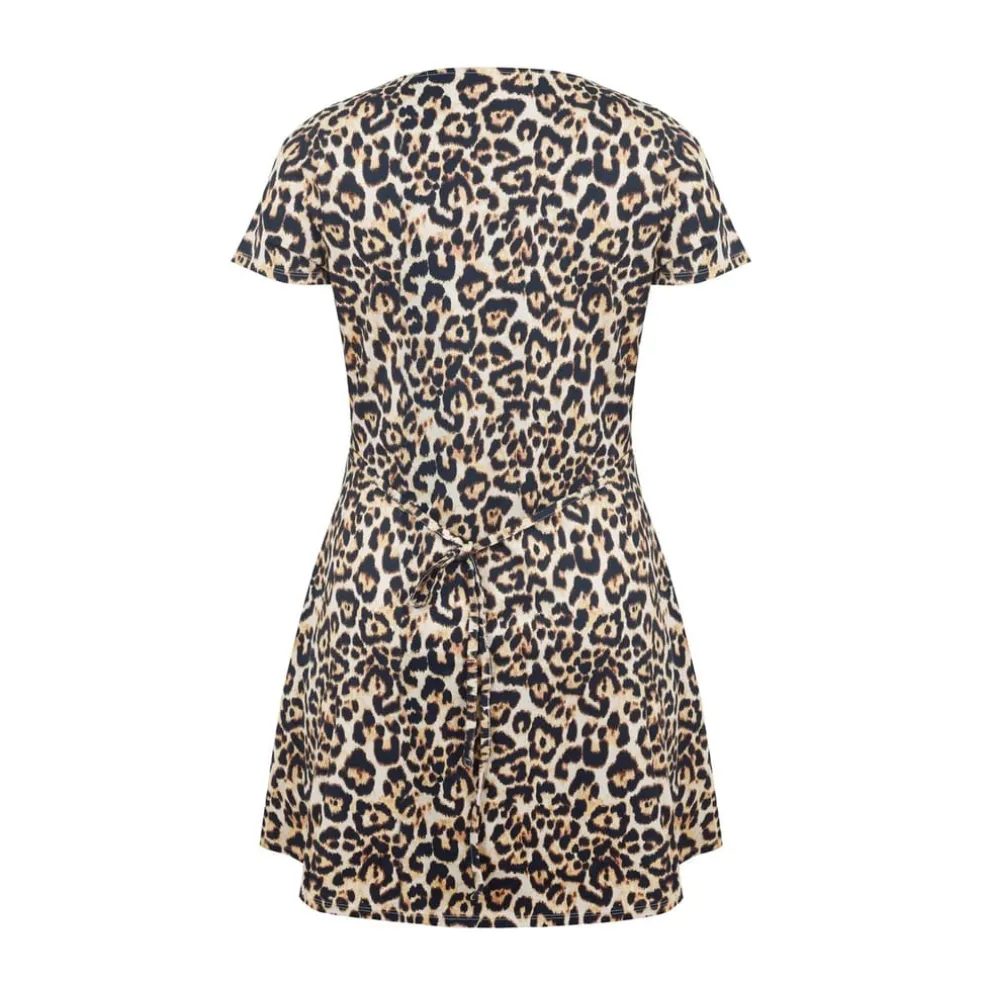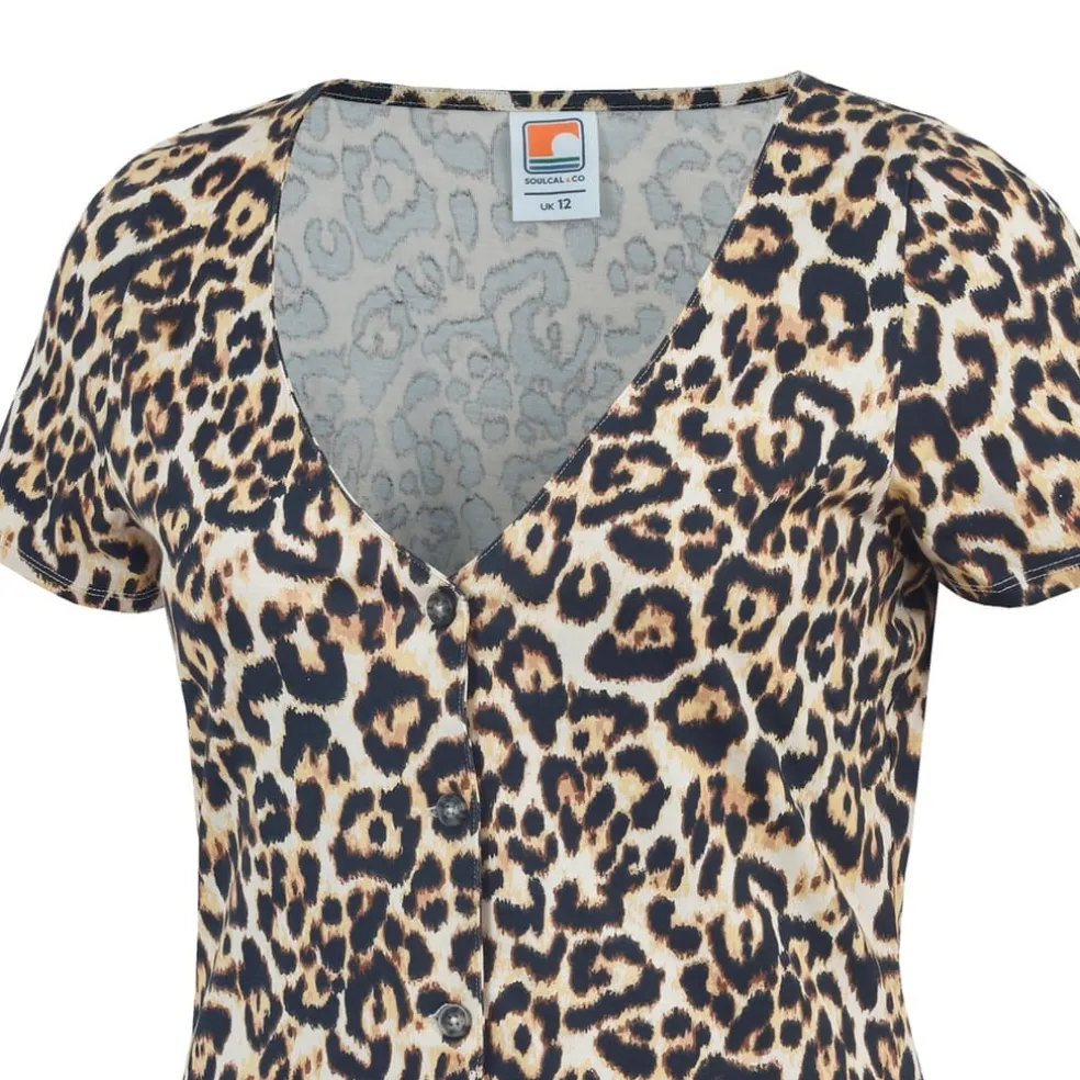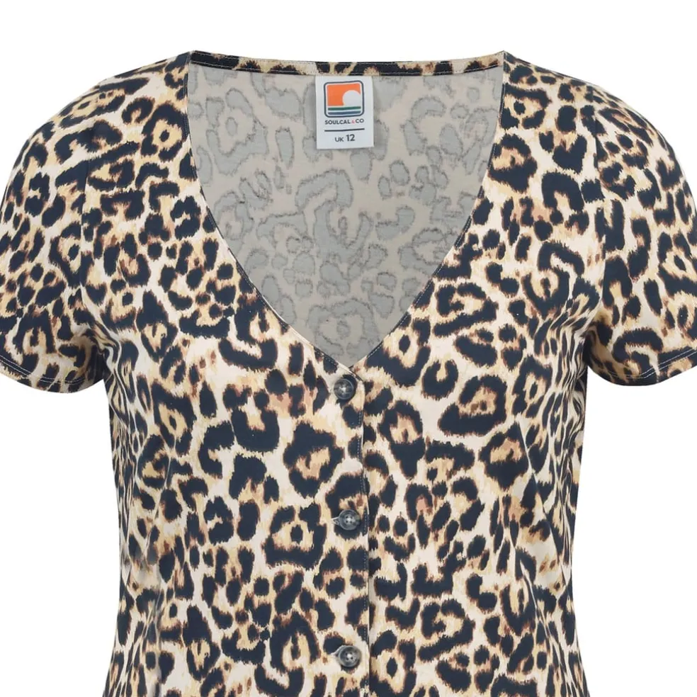 Discover the Soulcal mini dress, a perfect blend of style and comfort. This A-line dress features a striking animal pattern and a flattering V-neck. The short sleeves and button closure add a touch of elegance, making it a versatile choice for various occasions.