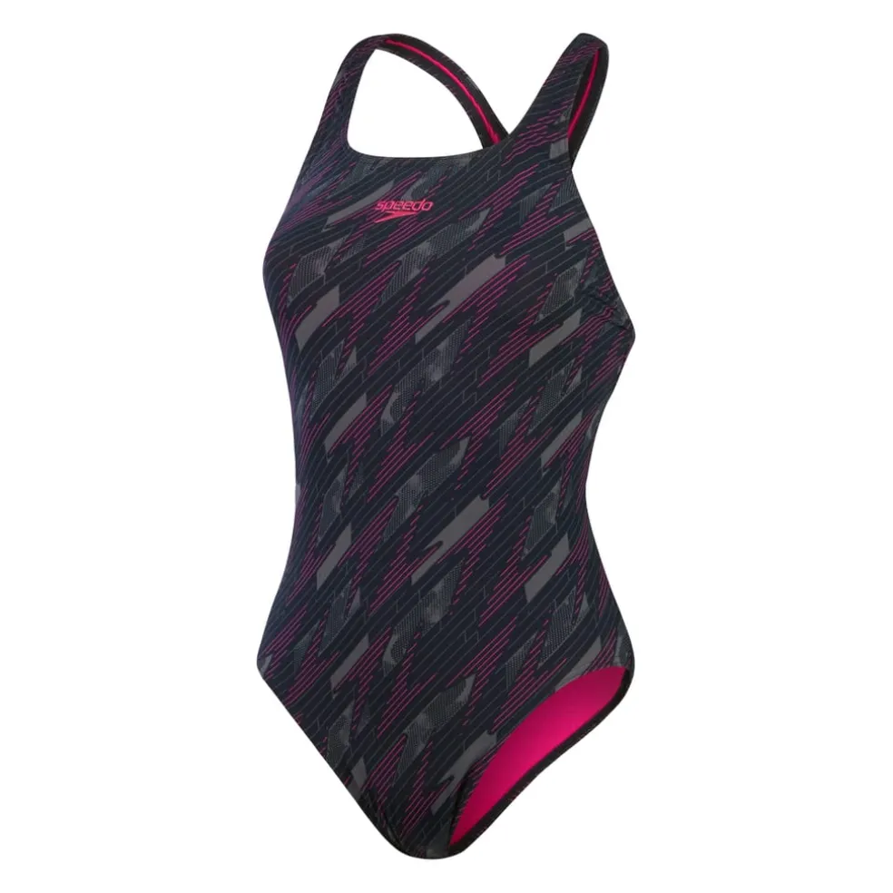 Make a statement in HyperBoom logo prints. Paying homage to our legacy graphics, our sporty black HyperBoom Medalist swimsuit showcases an evolutionary HyperBoom graphic in striking shades of pink and grey. Ideal for regular training, the medalist design aids shoulder movement and flexibility so you can cruise through your workout without feeling held back. Front and back lined for comfort and modesty, it’s made from our durable Endurance+ fabric, which is quick-drying and chlorine-resistant. Plus, the Polyester yarn in this fabric is made from 100% post-consumer waste, such as recycled plastic bottles.