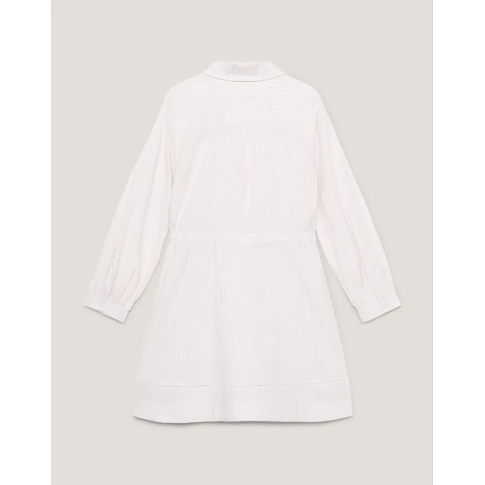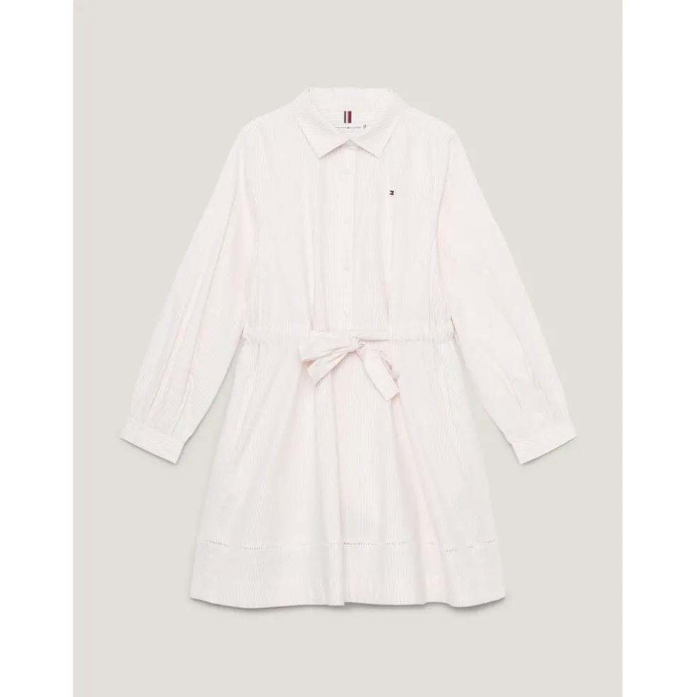 – Crafted from an organic cotton blend, this dress offers both comfort and sustainability, ensuring your little one feels comfort all day long. Furthermore its designed with a relaxed fit and mini length, exuding cute playfulness alongside breathability. The spread collar with a button-up front adds a touch of polished refinement, while the self-tie belt allows for a more adjustable fit. The three-quarter sleeves with one button cuffs lend a sense of refined elegance, making this dress suitable for both casual and semi-formal occasions. The all-over Ithica stripe detail adds a classic touch, effortlessly capturing the spirit of the Tommy Hilfiger brand. To add a final touch of intricate beauty, the lace ladder detail on the hemline showcases the brand’s attention to detail and craftsmanship, alongside the flag embroidery on the chest. Whether you’re attending a p
