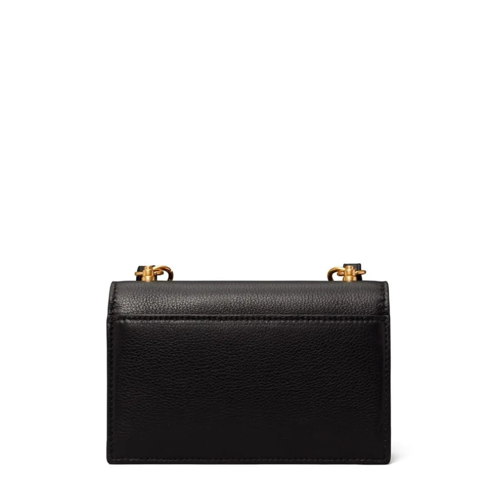 Renown for their artistry and attention to detail, the Tory Burch Miller Cross Body Bag has been crafted from a scratch-resistant natural grained leather boasting a staple colourway for a highly versatile styling piece. With a magnetic snap closure securing multiple internal compartments for ample storage, this bag is characterised with a signature Double T hardware embellished to the front for a designer stamp. Complete with an adjustable braided shoulder strap, this bag features a chain detailing to the upper for a luxe finish. H 17cm x W 11cm x D 8cm