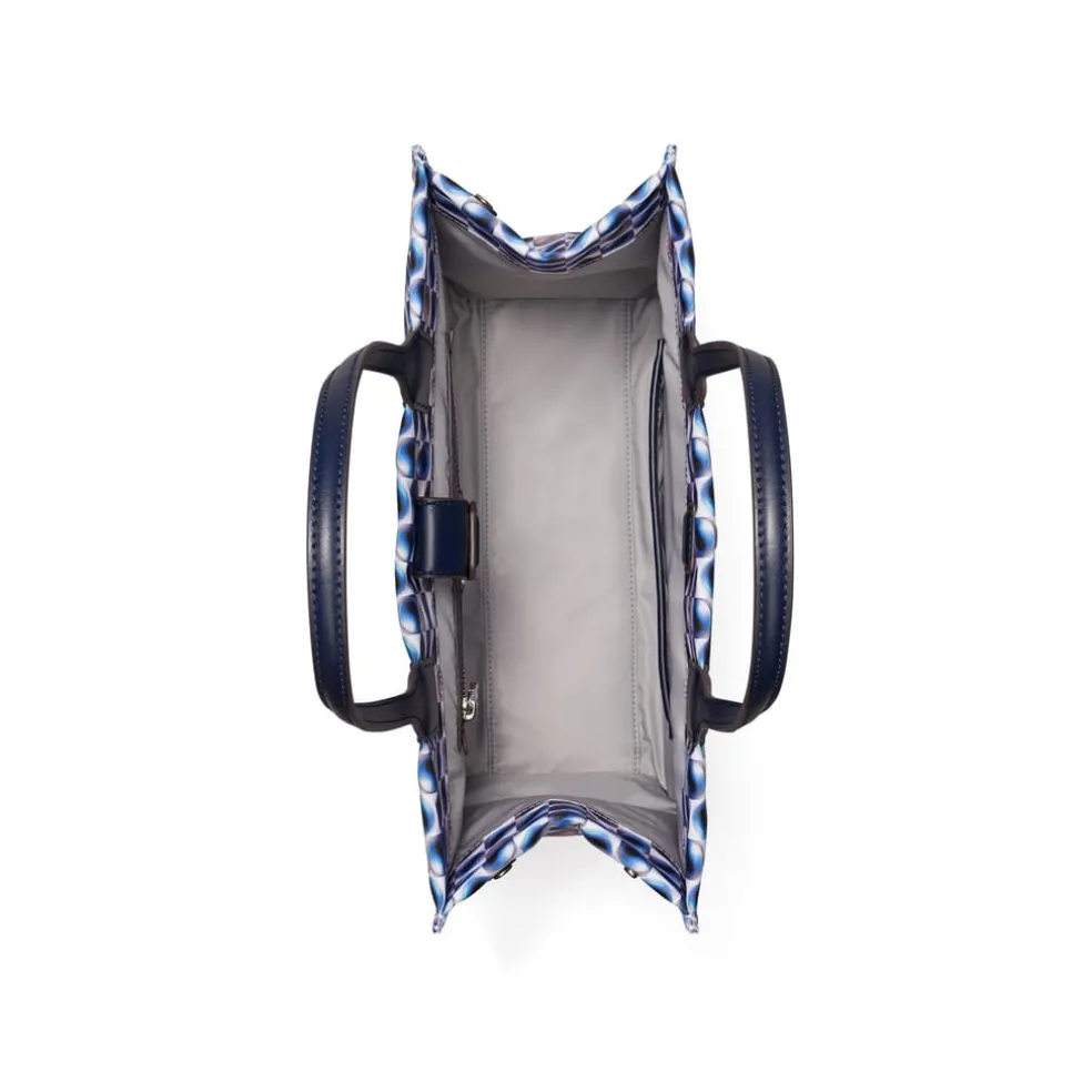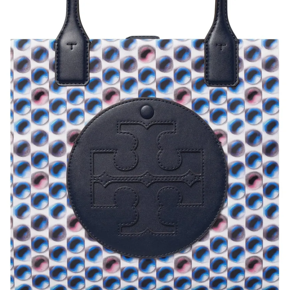 The Tory Burch Ella tote is a stylish and functional choice for your bag collection. Featuring a graphic print with geometric patterns, this tote is designed with a top handle for easy carrying. The snap button closure ensures your belongings are secure, while the logo embellishment adds a touch of brand elegance.