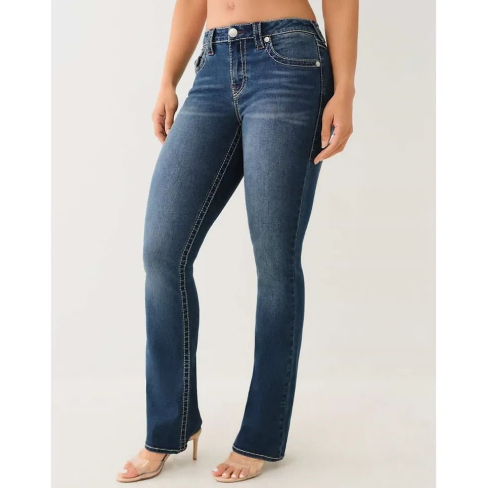 True Religion mid-rise bootcut jeans offer a regular fit with a classic zip fly and button closure. Featuring a five-pocket design, these jeans provide both style and functionality. Perfect for those seeking a timeless look with practical pocket embellishments.