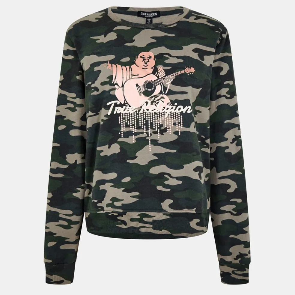 This True Religion top features a hooded design with a long sleeve and regular fit. The camo pattern is complemented by a distinctive Buddha print graphic and logo embellishment. Ribbed cuffs add a touch of detail to this stylish piece.