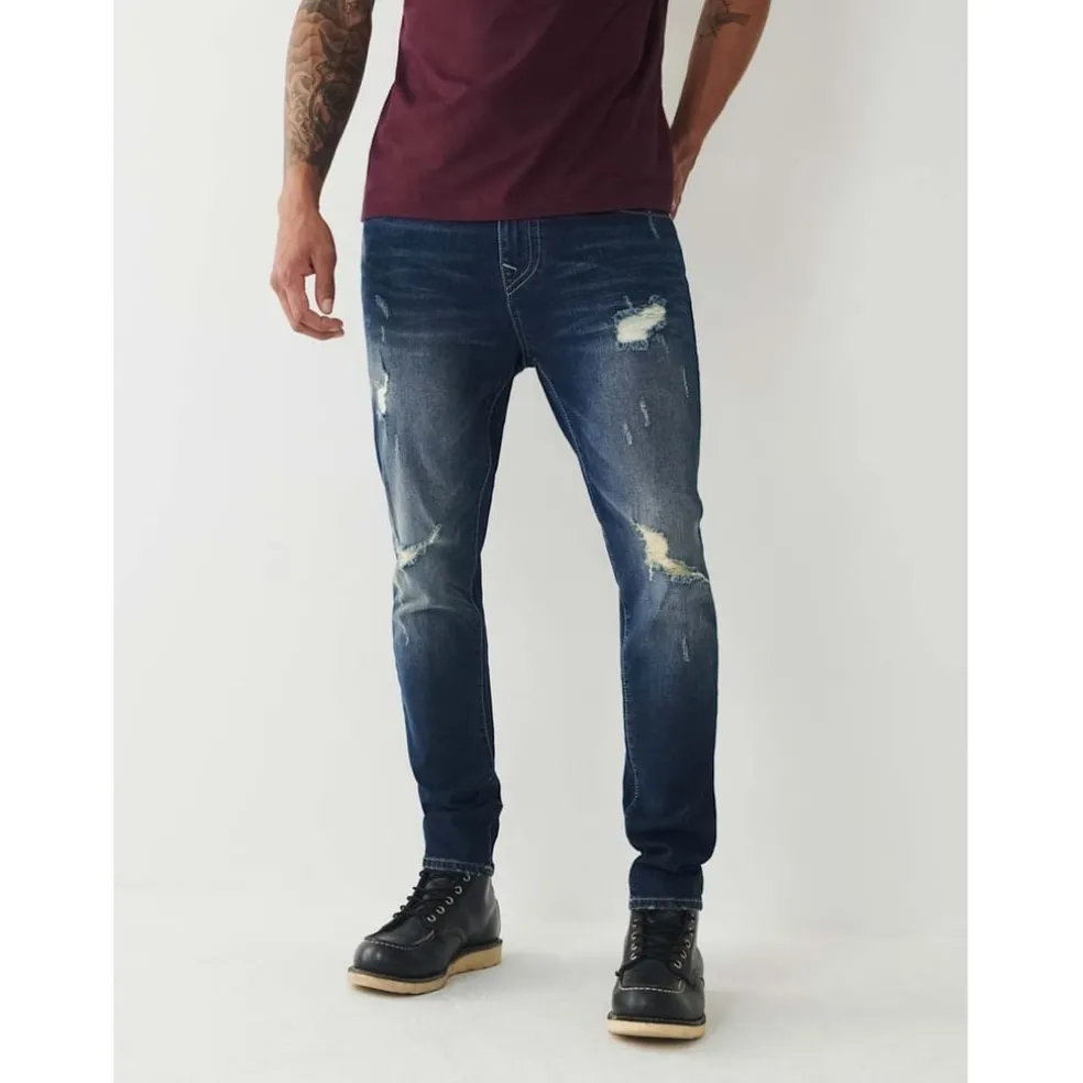 True Religion presents these distressed jeans, featuring a skinny fit for a sleek silhouette. The design includes a zip fly and button closure, enhanced with a logo and contrast stitching for added detail. Perfect for those seeking a stylish and contemporary look.