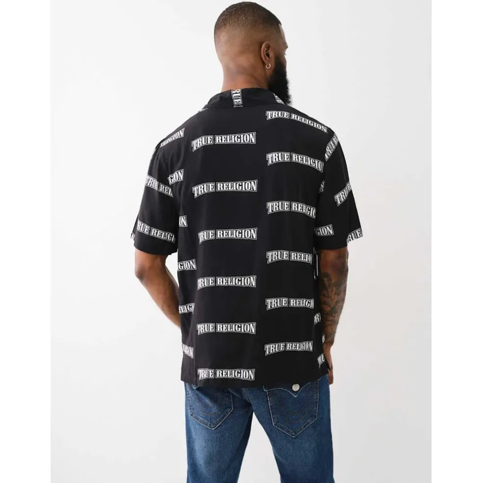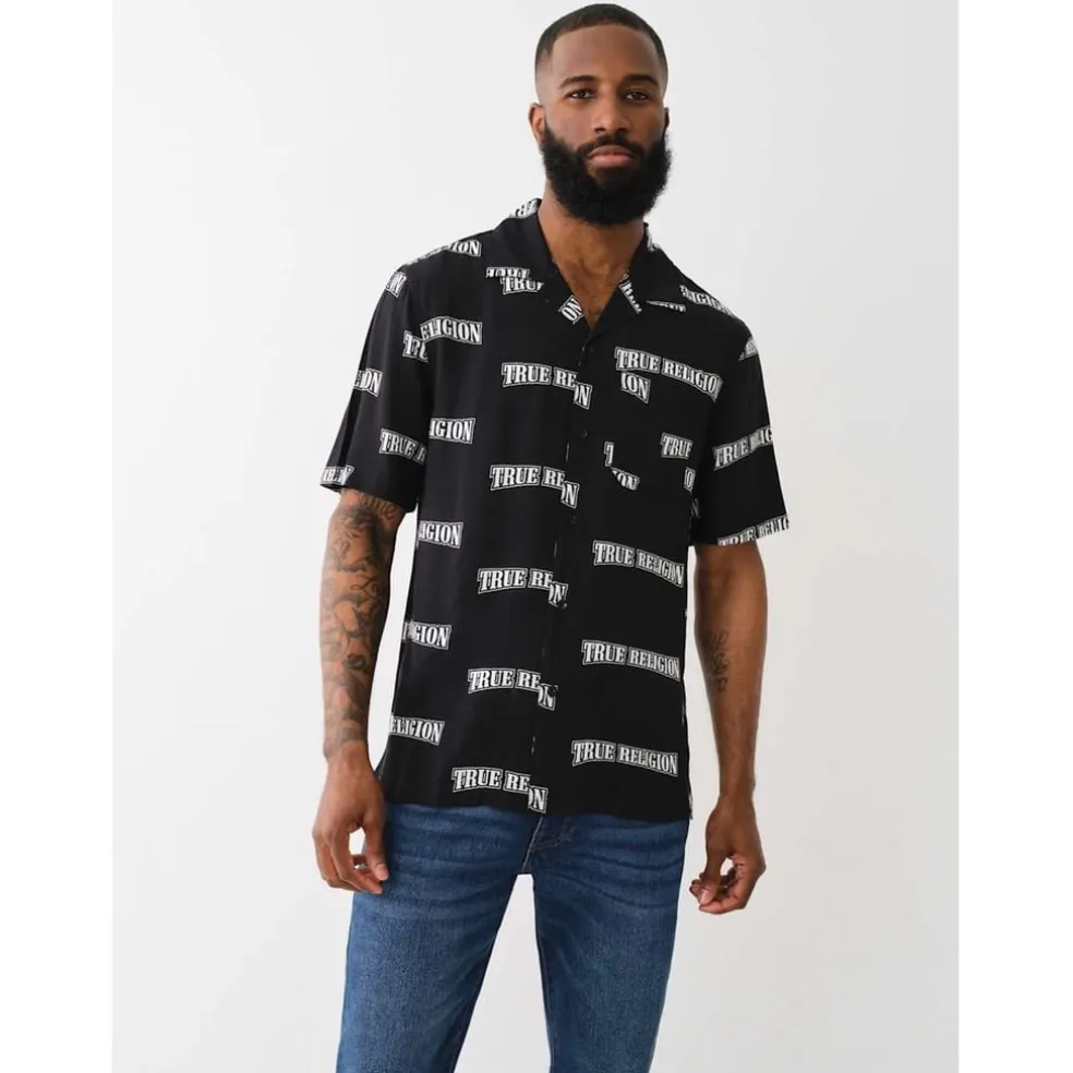 This True Religion top is a casual staple featuring a regular fit and short sleeves. The shirt collar and button-down closure add a classic touch, while the all-over logo print and lettering graphic provide a distinctive look. A logo embellishment completes the design, making it a versatile addition to any wardrobe.