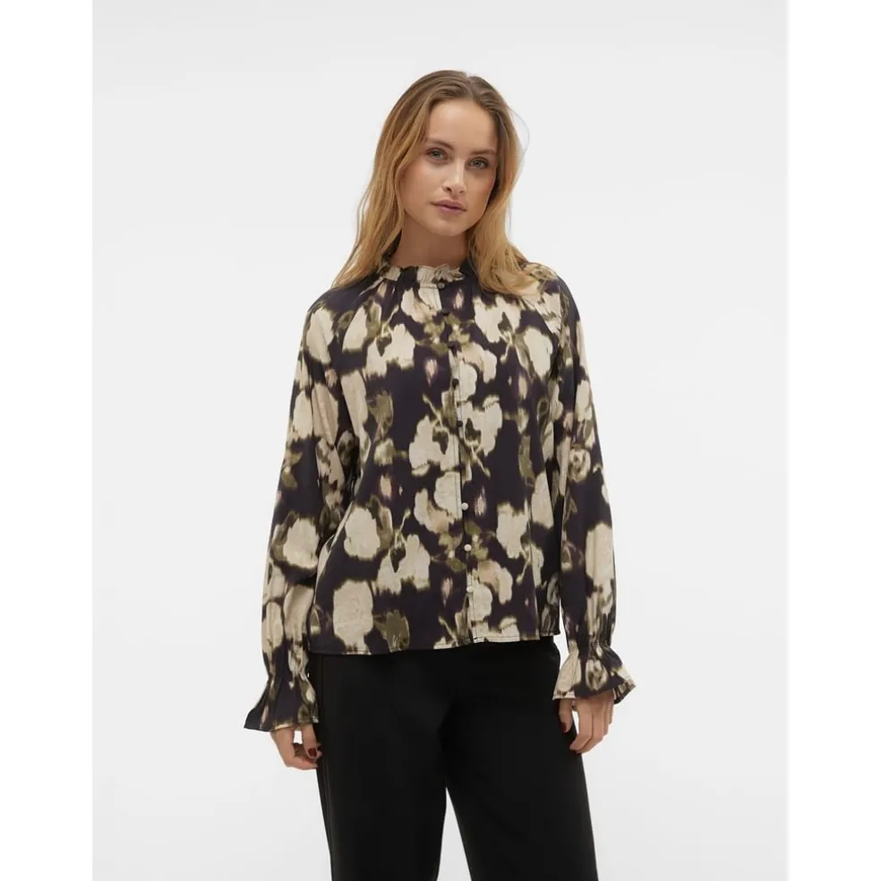 Elevate your wardrobe with this Vero Moda cropped shirt. Featuring a high neck and long sleeves, this abstract pattern dress shirt offers a regular fit. The button closure adds a classic touch, making it a versatile addition to your collection.