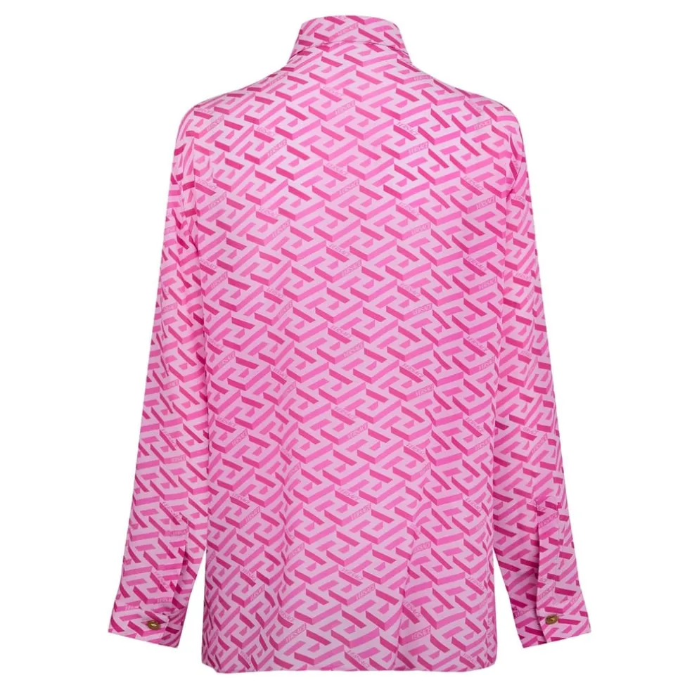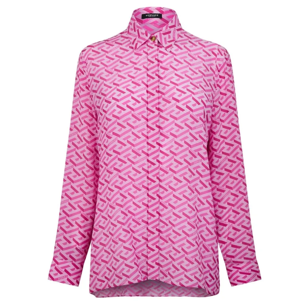 – Crafted from sumptuous silk, this shirt embraces a loose fit, ensuring a comfortable and effortless drape that gracefully cascades down the body. Complete with a straight hem and long sleeves featuring button cuffs, its elegant silhouette exudes timeless sophistication. Adorned with the brand’s iconic La Greca motif, a signature since 1988, the shirt has been modernised in 2021 with a captivating shadowed effect, adding a touch of intrigue to its already striking appeal. The point collar and concealed front button fastening, accented by a top gold-tone branded button, elevate its allure, making it a captivating addition to any wardrobe. Whether you pair it with a mini skirt for a playful twist or tailored trousers for a sleek evening look, the La Greca Print Shi
