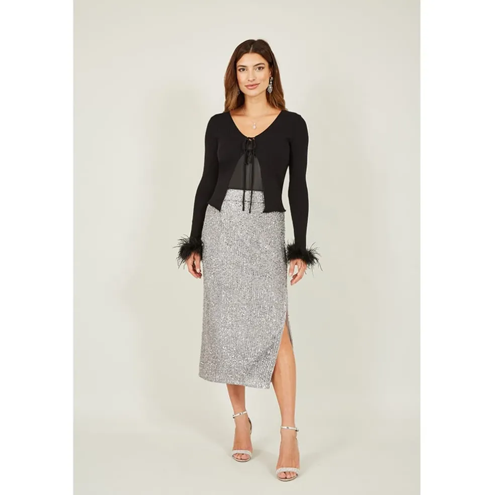 Impactful dressing can be achieve with comfort and style all tied up. This ribbed bolero from Yumi is the perfect marriage of sleek and statement style. With full length sleeves that finish with a flourish of feather on the cuff, and double tie front. Style this piece dressed up with a sequinned Cami and flowy wide legs trousers. Size reference, Small 8-10, Medium 10-12, Large 12-14.