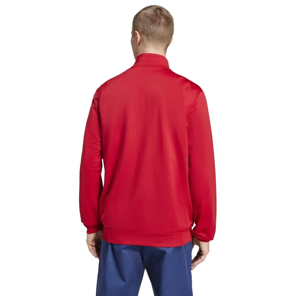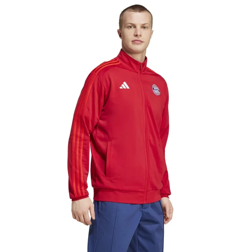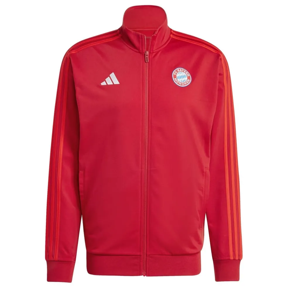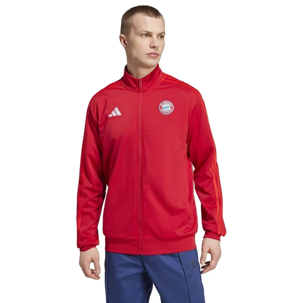 – The traditional home colourway in Team Power Red proudly supports FC Bayern Munich, emblazoned with the iconic full 3-stripes branding, an embroidered adidas logo on the right chest, and the FC Bayern Muenchen crest on the left, this track top represents not