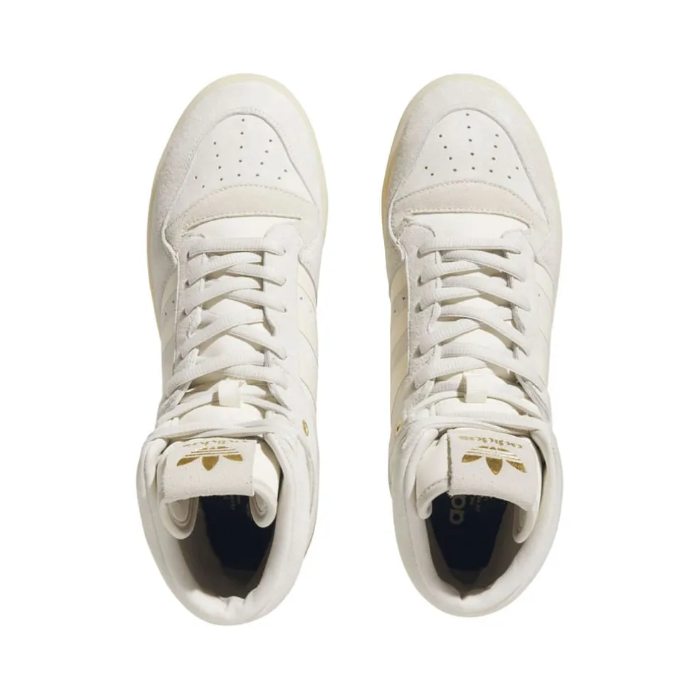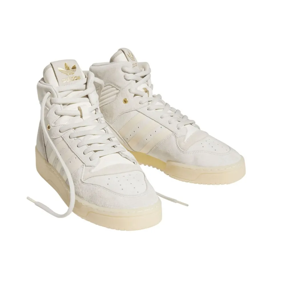 Step out with MVP energy. These adidas Rivalry High Shoes will add a hint of heritage style to any outfit. This favourite B-ball-inspired trainer gets a luxe update with a monochrome nubuck, suede and synthetic leather upper with metallic-gold accents. Wear them with anything and out anywhere. The iconic 3-Stripes show who you represent.