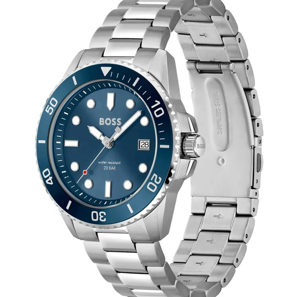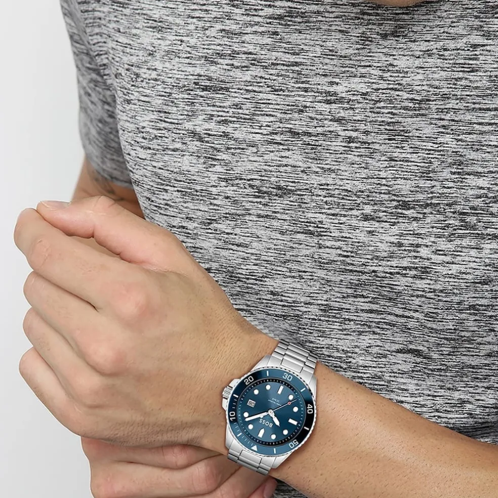 – A 43mm stainless steel case with blue bezel, blue sunray dial and stainless steel bracelet with push button deployment. Water resistant to 20ATM