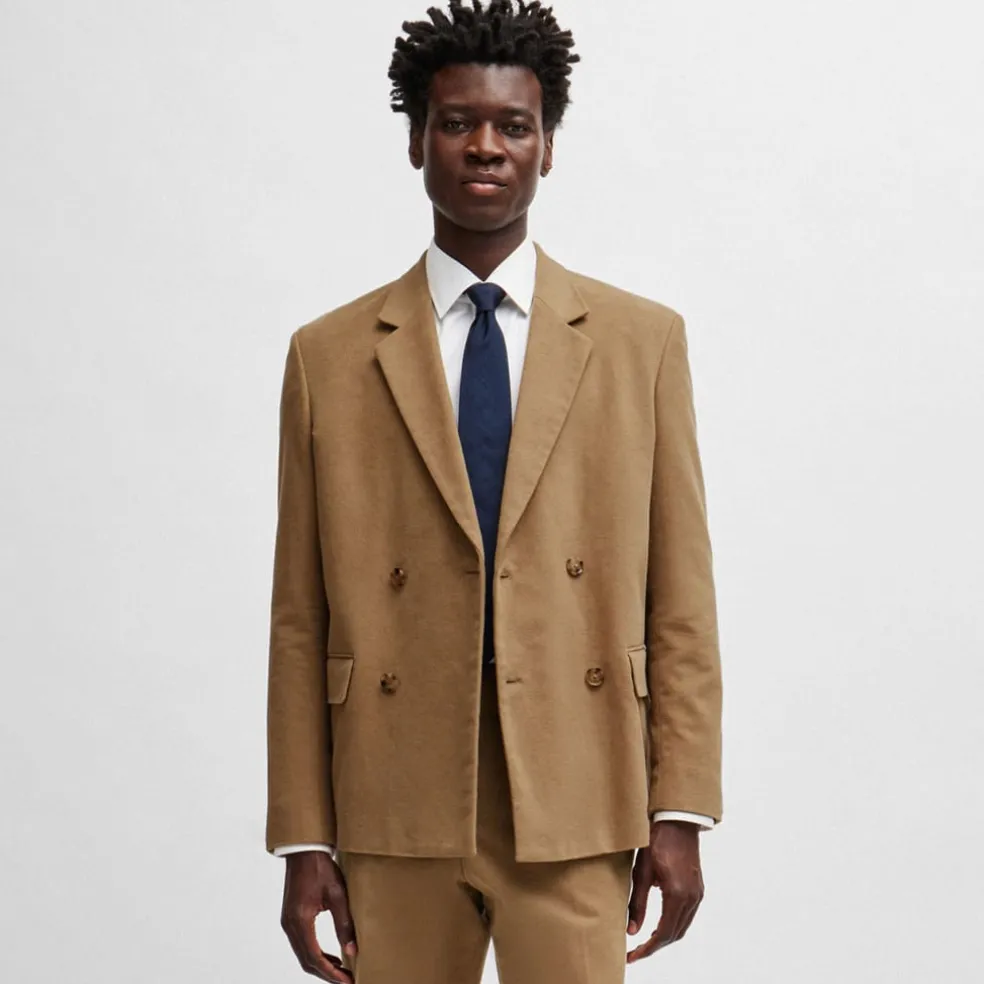 A double-breasted jacket in a relaxed fit by BOSS Menswear. This fully lined piece is crafted in peached cotton with a twill weave.