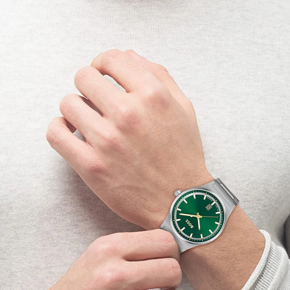 – A 41mm grey IP case, green dial with carnation gold accents, grey IP bracelet. Water resistant to 5ATM.