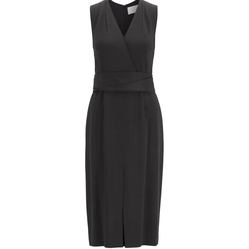 Women’s Boss Dapaly Dress. The elegant Dapaly dress by Hugo Boss is crafted from Italian crepe with a matte finish and a lustrous reverse side. This sleeveless design features a softly shaped V neckline and pleating at the upper front, plus belt detailing at the waist and a back zip closure. Turn to this fluid piece for a feminine option with business-ready appeal that will work well for a number of smart occasions. Material: 70% Acetate, 30% Viscose. Ref: 50414433001. Colour: black