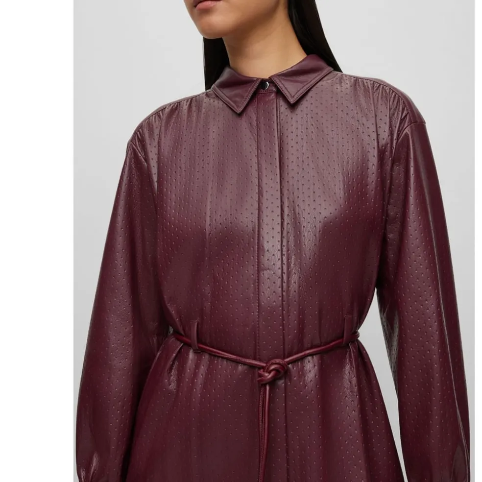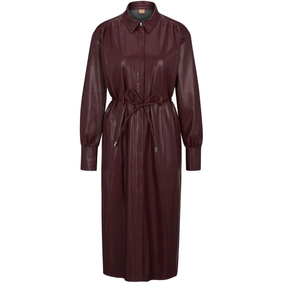 A relaxed-fit shirt dress with long sleeves, by BOSS Womenswear. Trimmed with hardware buttons, this chic dress is designed in embossed fabric with a light sheen and solid panels for contrast. A tie-up belt with hardware tips completes this contemporary piece.