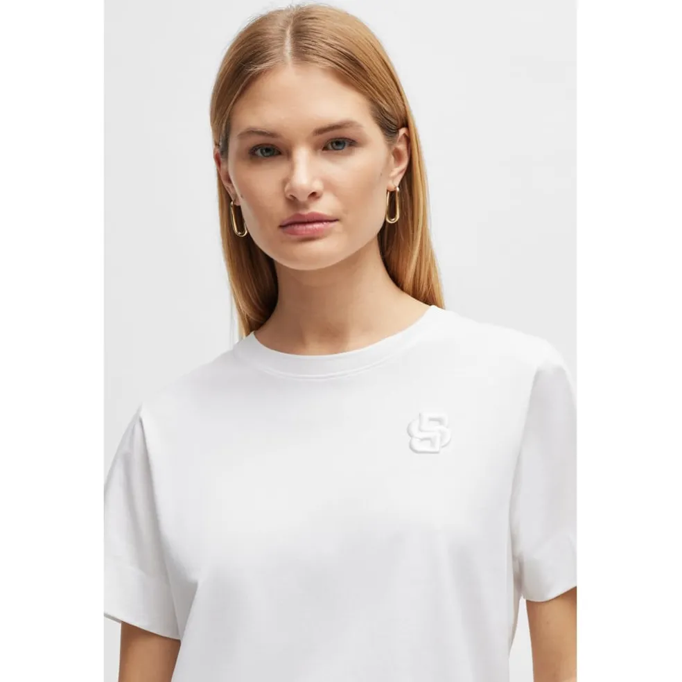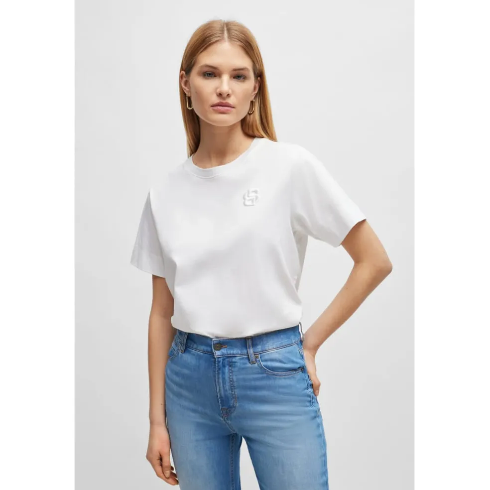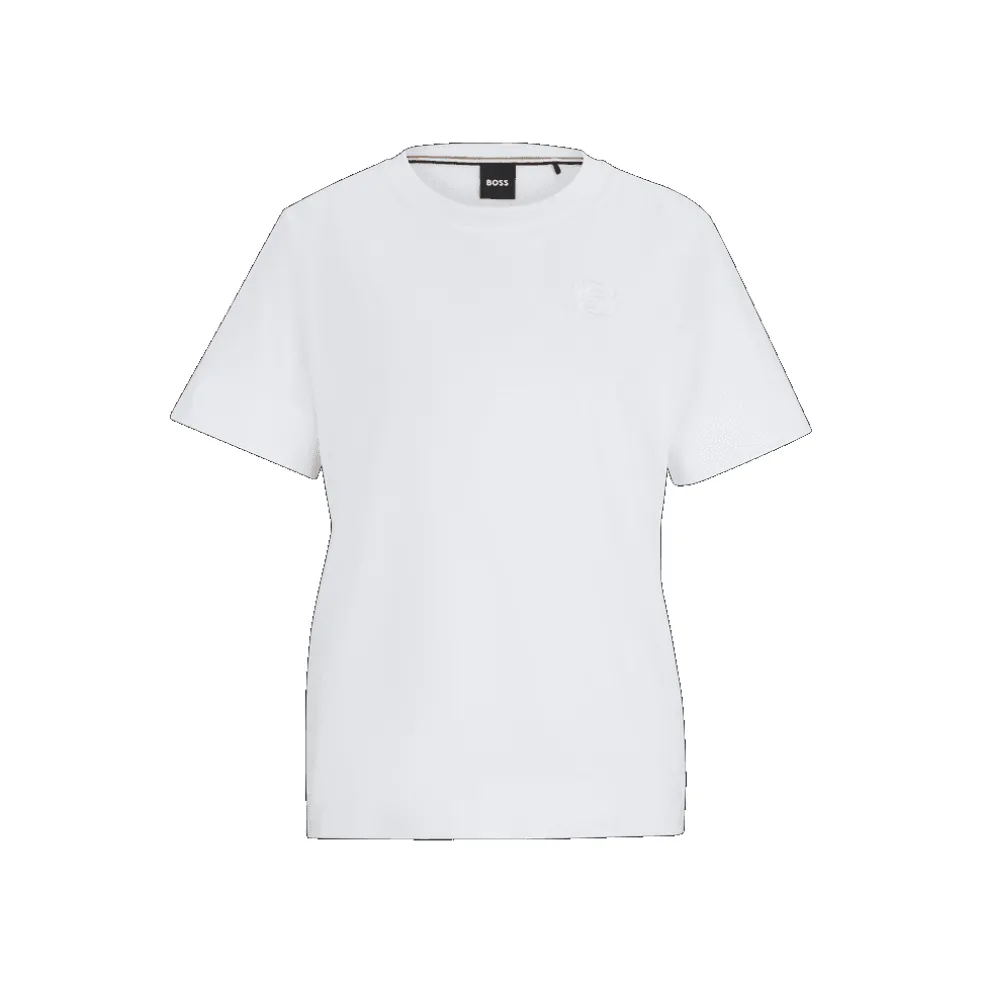 An effortless top crafted in mercerised jersey with a double monogram detail at the chest by BOSS Womenswear. Featuring the Double B monogram, which embodies the confidence and statement-making spirit of a true BOSS.For our BETTER BOSS products, we always use at least 60% better raw materials. This product’s better raw material is derived from regenerative agriculture: an approach focused on preservation and restoration that aims to increase biodiversity, preserve water quality and improve soil health while absorbing CO2. Regenerative agriculture also promotes animal welfare and fair working conditions for farmers. “Fit: Regular fitFit length: Standard lengthNeckline: Crew neckOccasions: LeisureSleeve length: Short sleevesFit: Regular fitFit length: Standard lengthNeckline: Crew neckOccasions: LeisureSleeve length: Short sleeves”