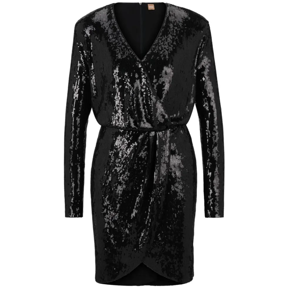 A statement evening dress by BOSS Womenswear. Featuring sequins all over for a chic effect, this long-sleeved dress is cut to a slim fit with soft lining and a fixed wrap detail at the front.