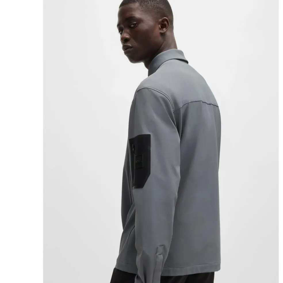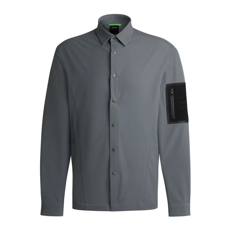 A water-repellent overshirt in stretch material by BOSS. This relaxed-fit piece has a seamless branded pocket on the sleeve.