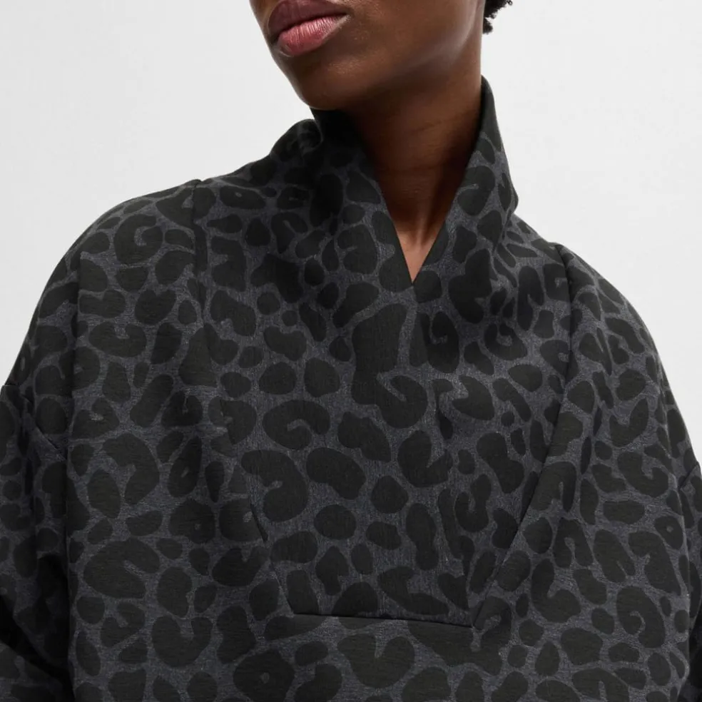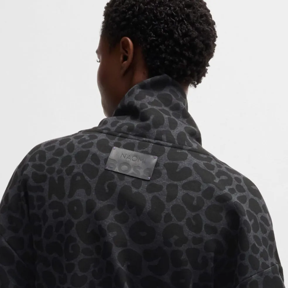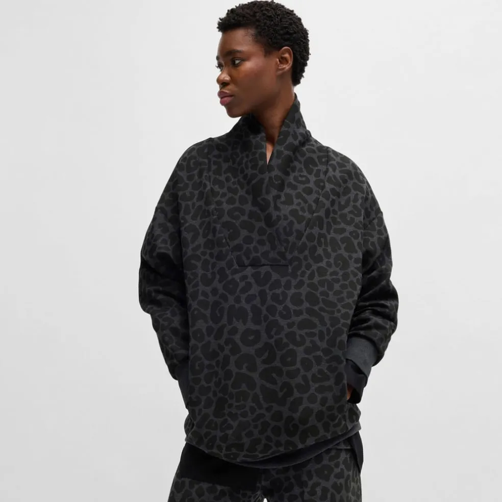 An animal-print sweatshirt with a shawl collar by NAOMI x BOSS. It features anti-stress energear™ technology, which returns the body’s own energy, emitted in the form of far infrared rays. The energy harnessed in this way can have a positive effect and provide a feeling of calm. Part of an exclusive capsule, co-created with Naomi Campbell, designed with elegance, confidence, and on-the-go ease in mind.