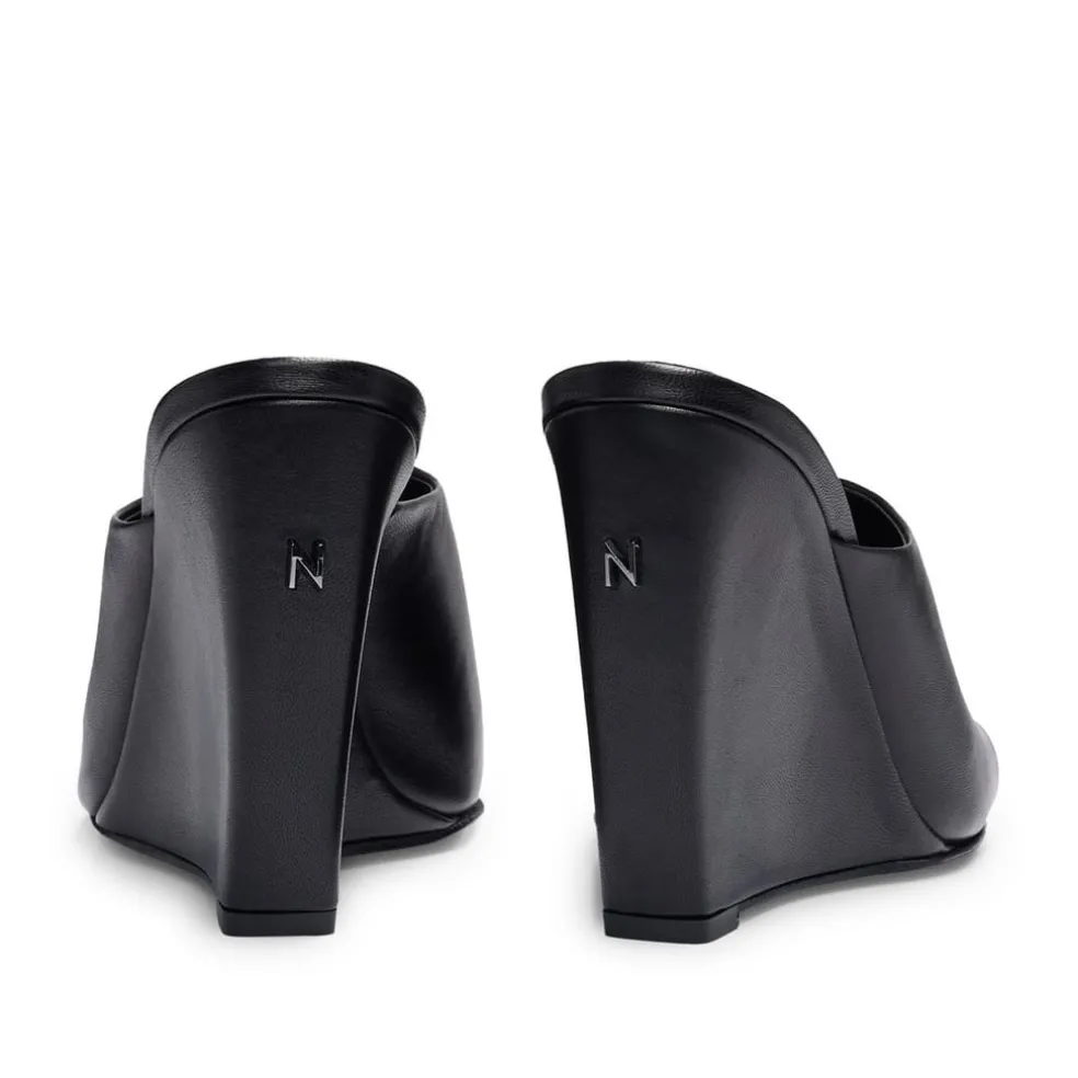 Versatile mules by BOSS, crafted in rich leather with a squared open toe and a tall wedge heel featuring a branded trim. Added padding and a smooth leather lining for heightened comfort. Part of an exclusive capsule, co-created with Naomi Campbell, designed with elegance, confidence, and on-the-go ease in mind.