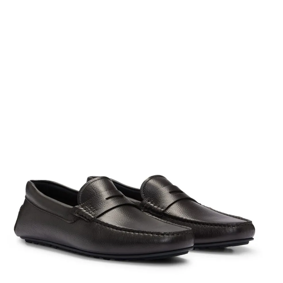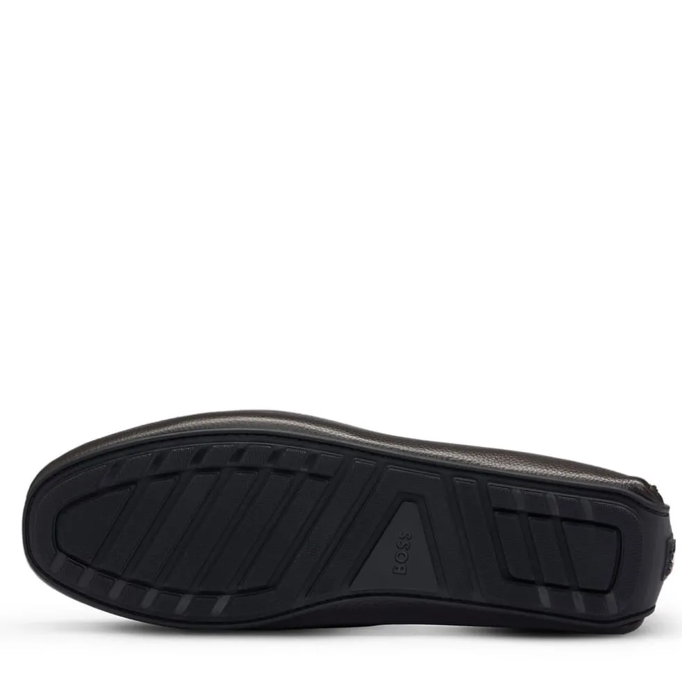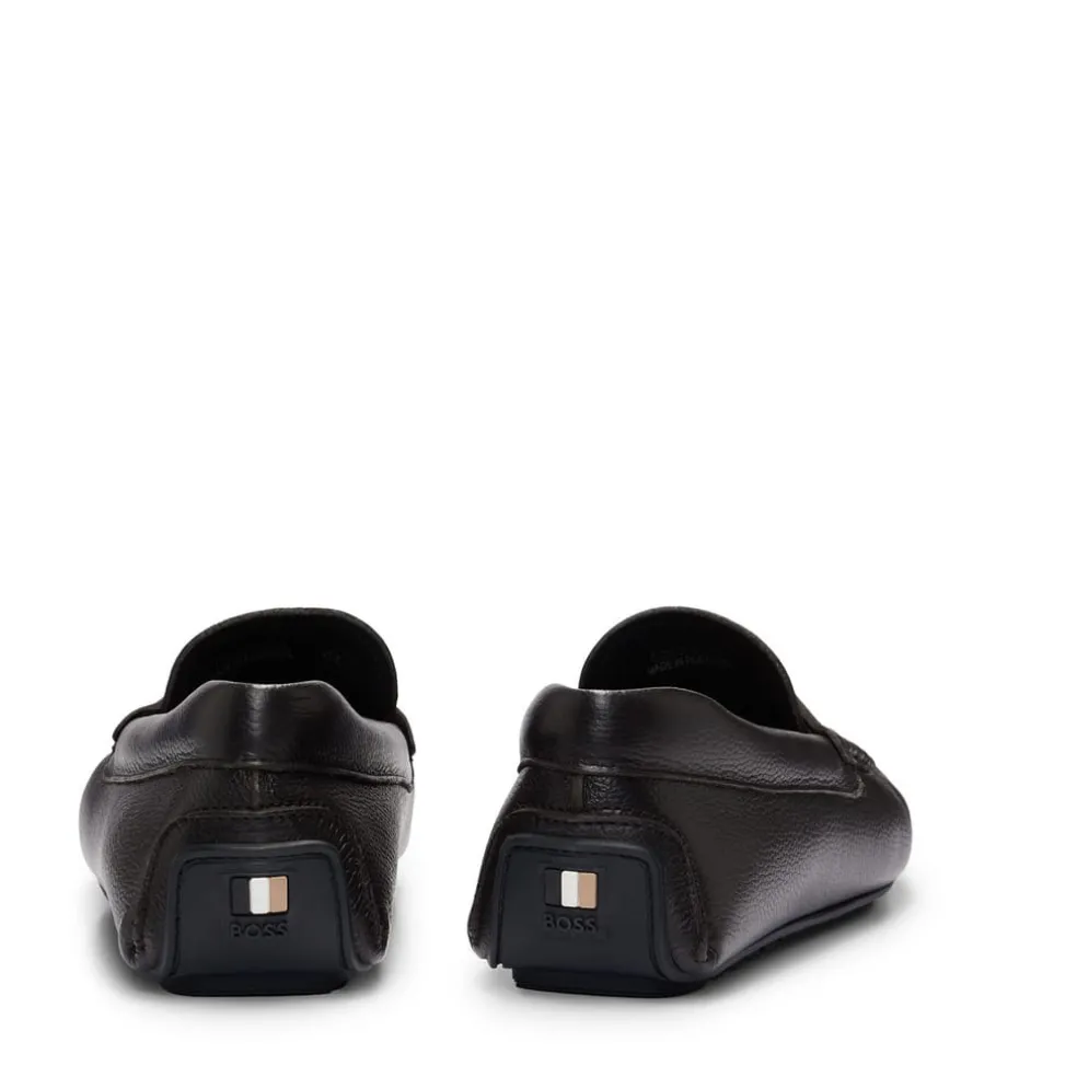 Premium driver moccasins made in Portugal by BOSS. Featuring a full rubberised sole, this pair is crafted in grained leather with a debossed logo strap.