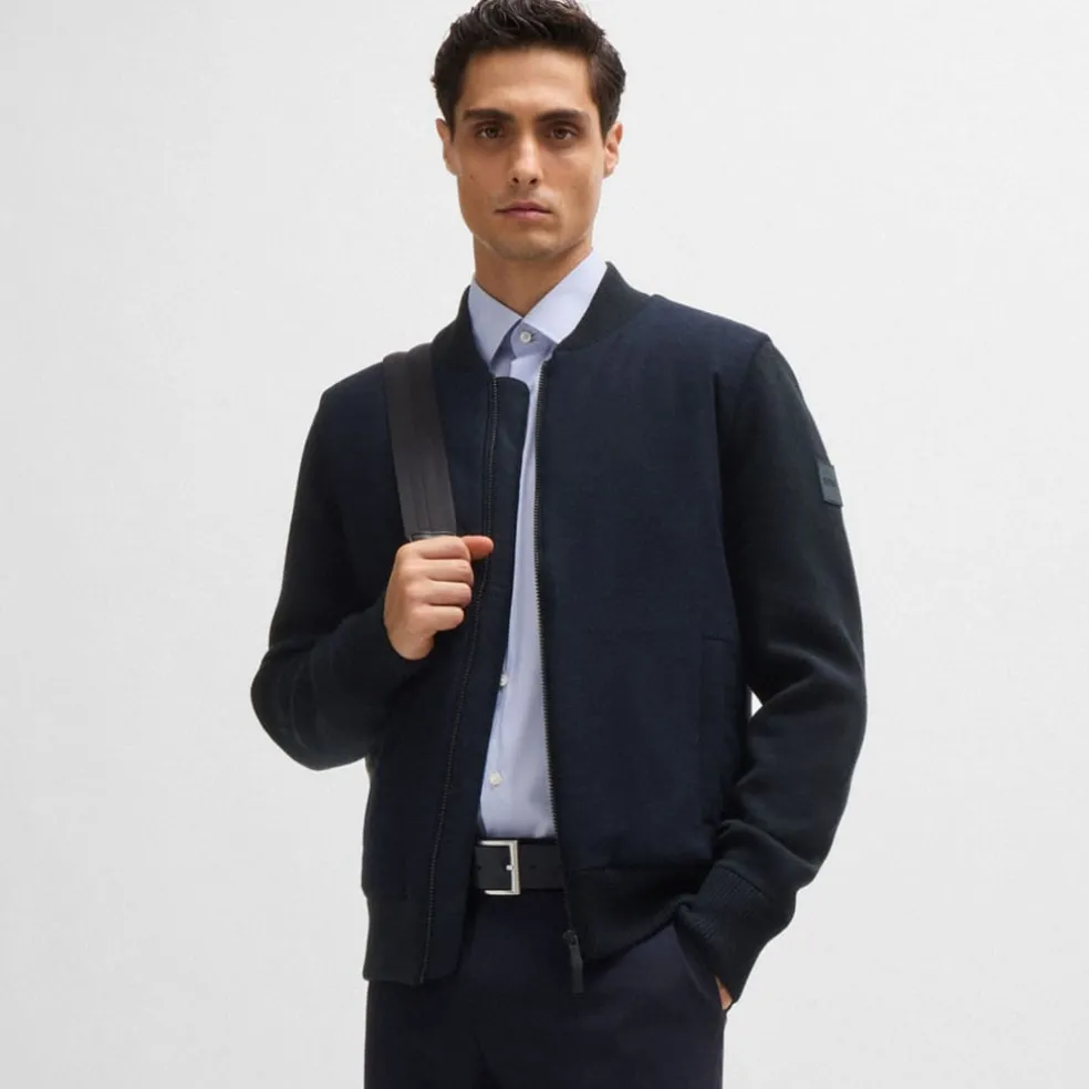 Boss P-Eflano Regular-Fit Knitted Bomber Jacket in Dark Blue